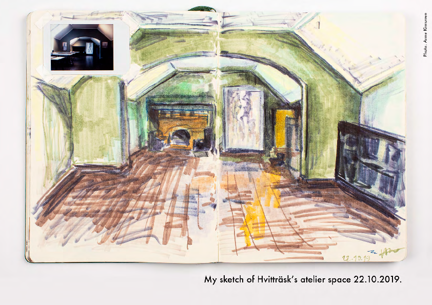 The specificity of this last case study was that I was able to present my artworks inside of my source of inspiration. My third dissertation related exhibition took place in Hvitträsk. During the process, I was able to spend a lot time in there, I was drawing the place and imagining how and what kind of artworks would fit in there. Here you see my sketch of the atelier space.
