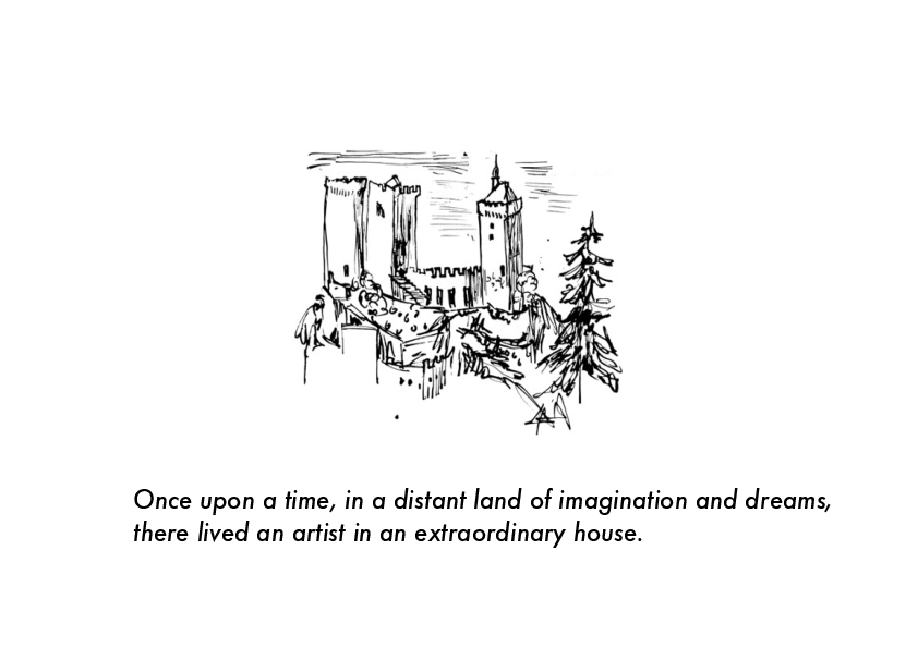 Once upon a time in a distant land of imagination and dreams lived an artist in an extraordinary house. Before finding the house, the artist had been wondering lost in the woods for a long, long time. That house was like an amoeba; it was able to transform and renew, sometimes new rooms would appear, and others disappear. After some time in the house, the artist began to learn how to affect the changes in the house; some wishes of the artist would then materialize even though sometimes it happened before she even knew what she had been hoping for. Sometimes the house resembled a modest cottage, another time it became more like a castle, with numerous rooms and towers. The outside of the castle would change too, from sea to forest or a garden filled with flowers, all in bloom even in the middle of the coldest darkest winter.