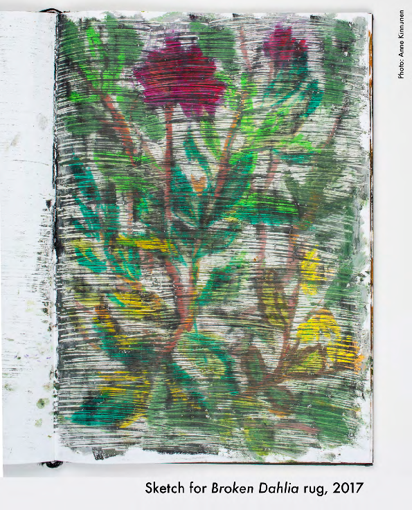 Monet was passioned about light and this directed me to work with grattage technique. Many of you might know this technique from the elementary school, first an oil pastel-drawn image is covered with a darker colour layer, which is then scratched with a sharp tool such as needle or knife. As a result, the image beneath becomes partly uncovered. Now a previously figurative image had gone through abstraction, broken into tiny fragments, where small areas of colours were divided by countless incisions. Later I reworked these sketches into woven jacquards and hand-tufted rya rugs.