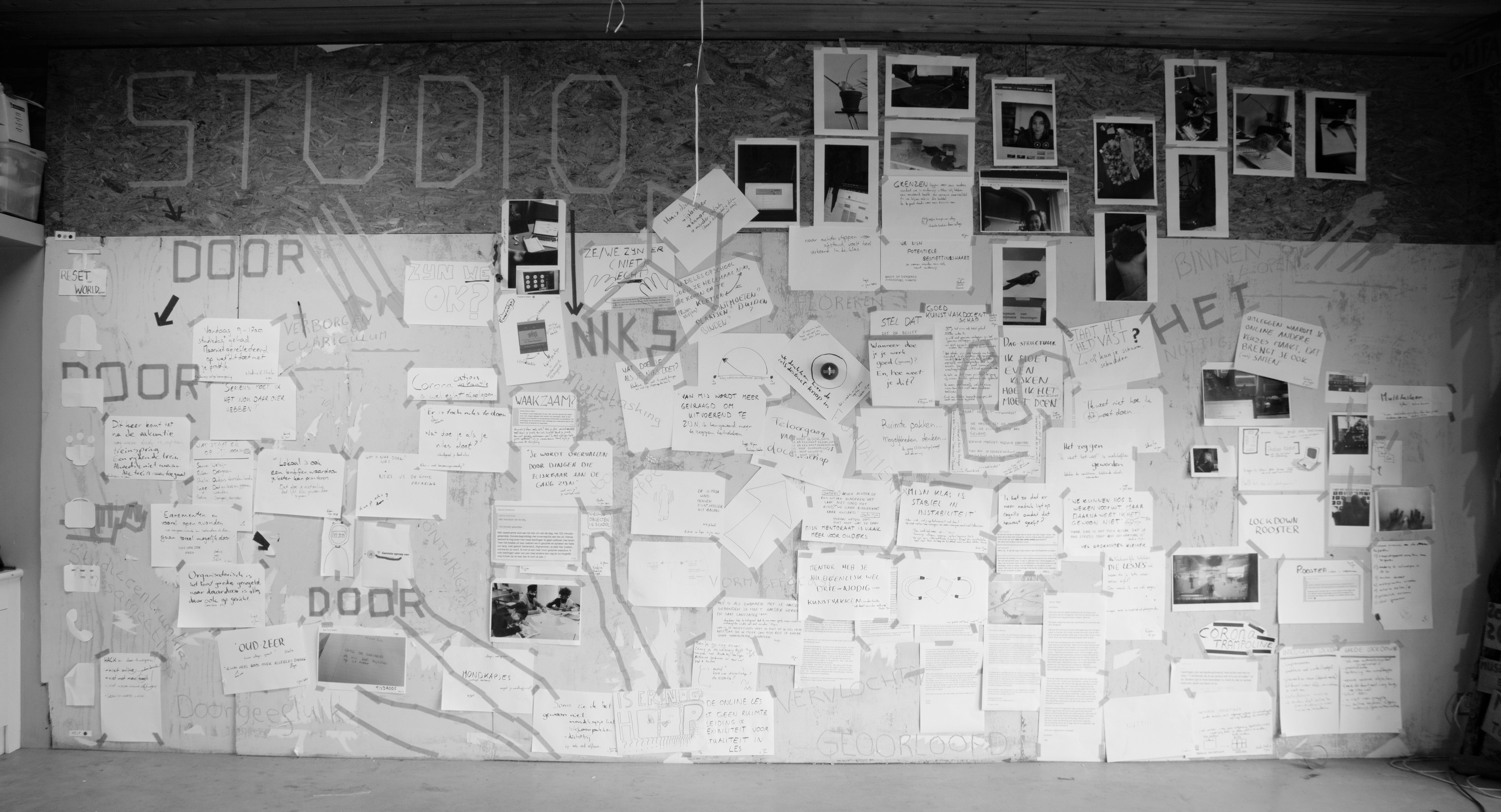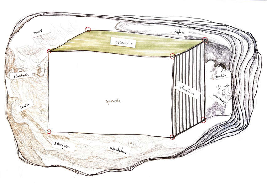 Welcome to "Studies in Kunstvakidiotie". Here, you can browse through the photographs, essays, drawings, audio and video clips. ‘Studies in kunstvakidiotie’ is the doctoral research of Mirjam van Tilburg at Antwerp Research Institute for the Arts (ARIA). This is a study in arts education from within the arts. She tries to shift the dominant image of life-long-learning (LLL) and provide insight into the possibilities that this LLL space also provides to art teachers. By searching in this way, more and more became clear about life-long-learning of art teachers. Therefore, a linear cause-and-effect narrative did not seem to do justice to the subject matter. The term ‘studies’ in the title is sketchy — it also involves repetition and seeking connections and, above all, it is a derivative of studio and study. Five essays form the markers within ‘Studies in Kunstvakidiotie’. Together, they construct a narrative. The essay ‘(onder)zoek in kunsteducatie’ describes practices and values that stem from Mirjam van Tilburg’s artistic practice: education. The motivation behind this research is that art teachers find LLL events to be limited. The essay ‘LLO als commoning practice’ discusses the possibilities of commoning practices. The examples: The New School Collective and studios are outlined herein. The studios are the experiment within this doctoral research. During the winter of 2020-2021, Mirjam van Tilburg worked with ten art teachers. The experiment of this doctoral project coincided with the Covid-19 crisis. Together they occupied artist studios in Tilburg and Rotterdam to de-automate and look at teaching practices. The essays ‘Blik’ and ‘Tijd’ therefore propose two topics of conversation within LLL: the ‘aesthetic glance’ and the temporal experience of ‘interruption’. These essays question the efficient and productive order prevailing in the work environment and LLL of art teachers. The essay ‘Herontdekking van Kunstvakidiotie’ is the story of a change in the craft of art teachers in the first Covid-19 crisis year. The term ‘kunstvakidiotie’ in the title cannot be directly translated into English because it is a compound word and may have specific connotations in the Dutch context. The essay describes how in these studios, art subject teachers had one foothold: artistic fervour.