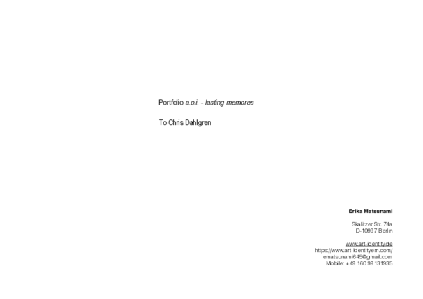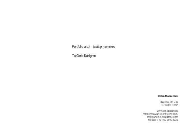 The project is a.o.i. - lasting memories, which is focused on the topic of life from the aspect of molecular biology in the 21st century. This project is for an improvisational performance with Chris Dahlgren (contrabass) in the installation, which project I explored after the Corona pandemic in early 2021. Therewith, I explore ethics and aesthetics with Chris Dahlgren (contrabass) from both aspects of music and visual arts at a practical level interdisciplinary (improvisation). Musicology is progressing from representation of the ethics and aesthetics by the traditional music scores to exploring 'embodiment' towards ethics and aesthetics "on site" from the perspective of cognitive science in the 21st century. Therefore, as an artistic method is improvisation. According to the art representational theory by Richard Wollheim, he explored in his essay "Art and its objects : an introduction to aesthetics" in 1968.