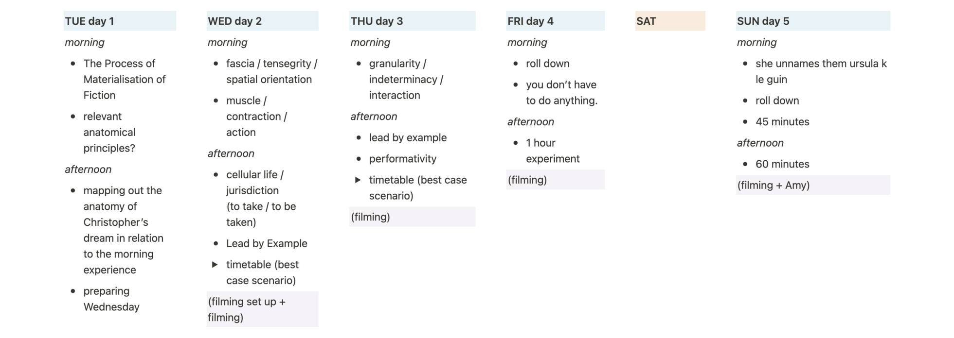 Having made these observations, I decided to focus the workshop week on sharing methods with Christopher and Anais–neither of whom are experienced dance scientists–with which to begin organising the superficial relative to what is going on beneath the surface. These are the skills needed, is how I explained it to myself, to being targetting the question of certainty: how do we learn to relate to those sensations that informed all of our behaviours, if–having received the diagnosis–the names of the behaviours themselves changed? If we spent the majority of our lives masking our behaviours, how to we learn to recognise the mask and become able to see the behaviour in its own right? What do we need to know to be able to do that, to make those distinctions? Sensorially? Emotionally? Intellectually? What will our behaviours looks like, if ever they get to “look like” independently from the masks they necessitated being covered with? And finally, what will we learn about ADHD, if we get to behave ADHD without masking? How does ADHD behave: how does it move? How does it dance?