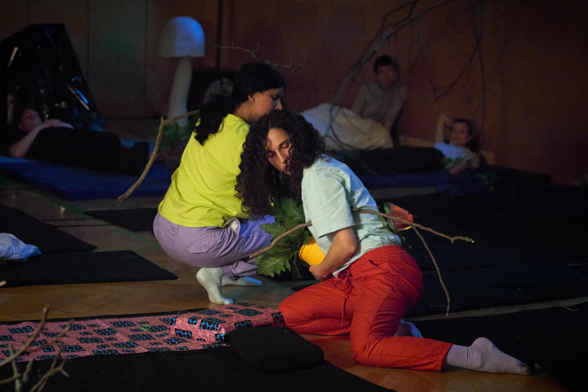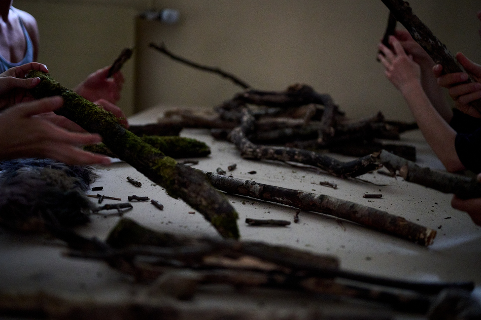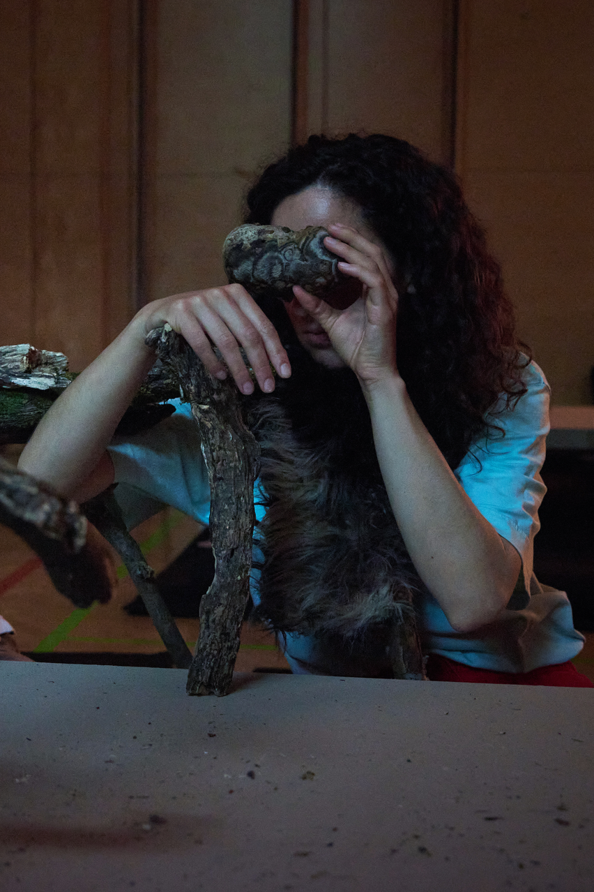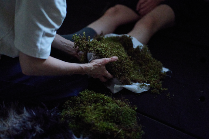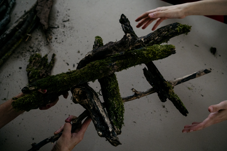 In the course of the performance, which is underpinned by an (atmospheric) sound collage (Lisa Kortschak, Elise Mory) structuring the room, the audience is invited, e.g., to make sculptures from branches on the tables, touch moss, leave a handprint in moist clay reminding one of a biological footprint, feel plants, smell herbs, lay down unter blankets of foliage or tree-branch tents, or to choose their own rather contemplative/meditative positions (often reclining) in the natural landscape near the end of the performance.