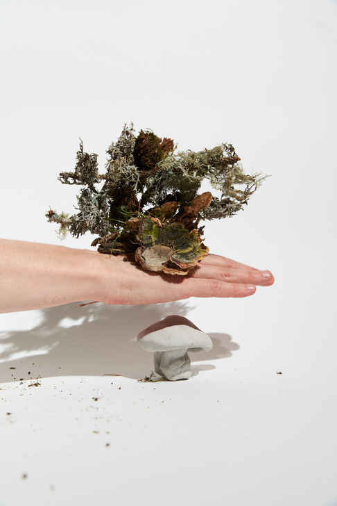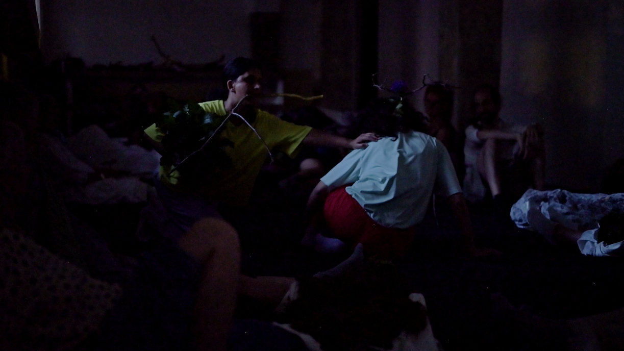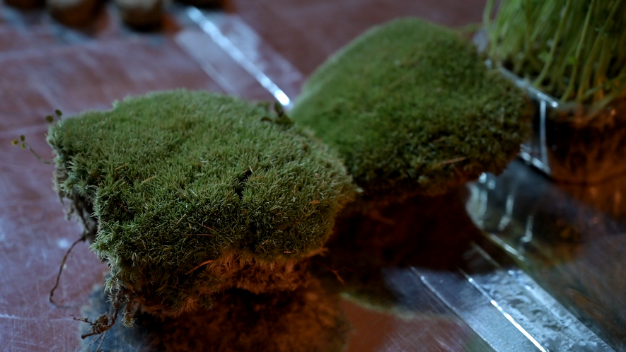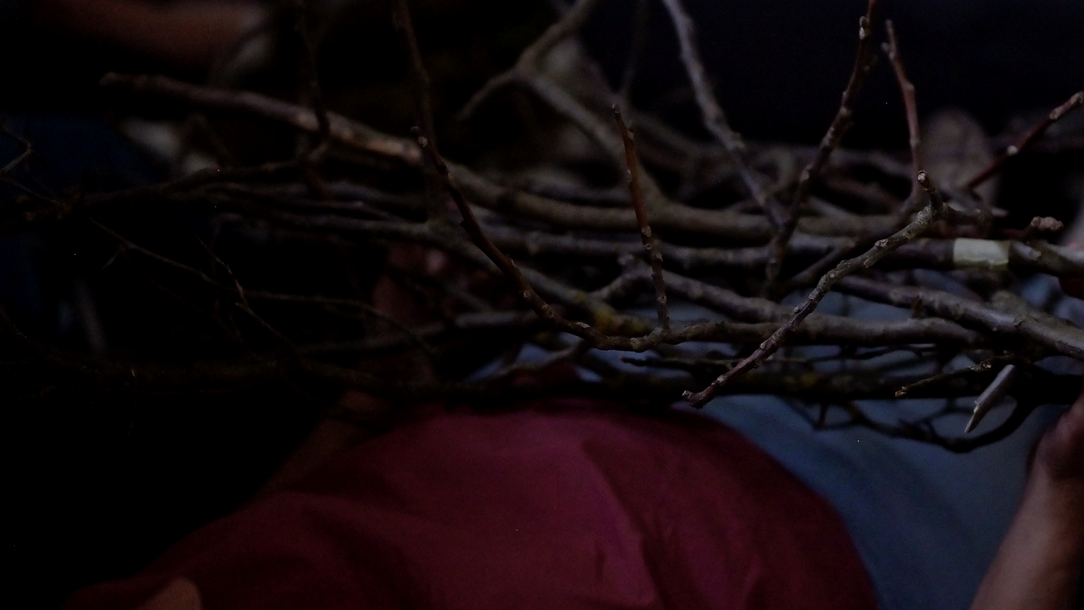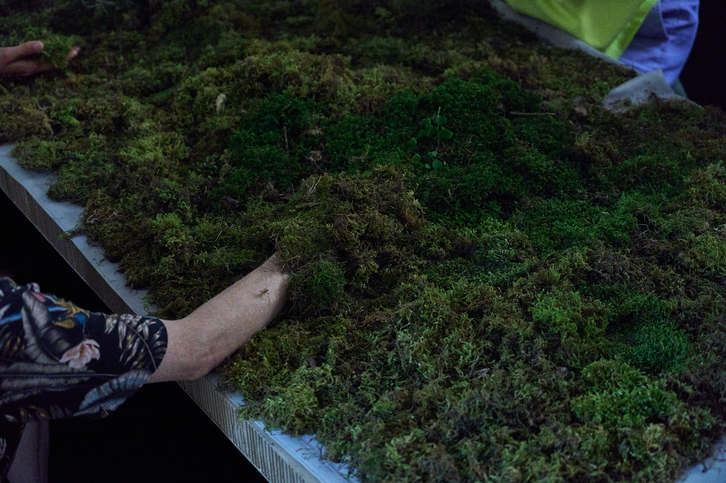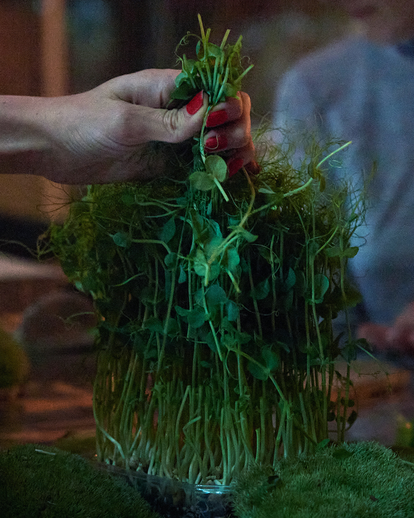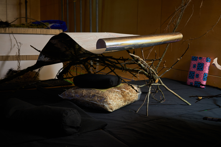 In the course of the performance, which is underpinned by an (atmospheric) sound collage (Lisa Kortschak, Elise Mory) structuring the room, the audience is invited, e.g., to make sculptures from branches on the tables, touch moss, leave a handprint in moist clay reminding one of a biological footprint, feel plants, smell herbs, lay down unter blankets of foliage or tree-branch tents, or to choose their own rather contemplative/meditative positions (often reclining) in the natural landscape near the end of the performance.