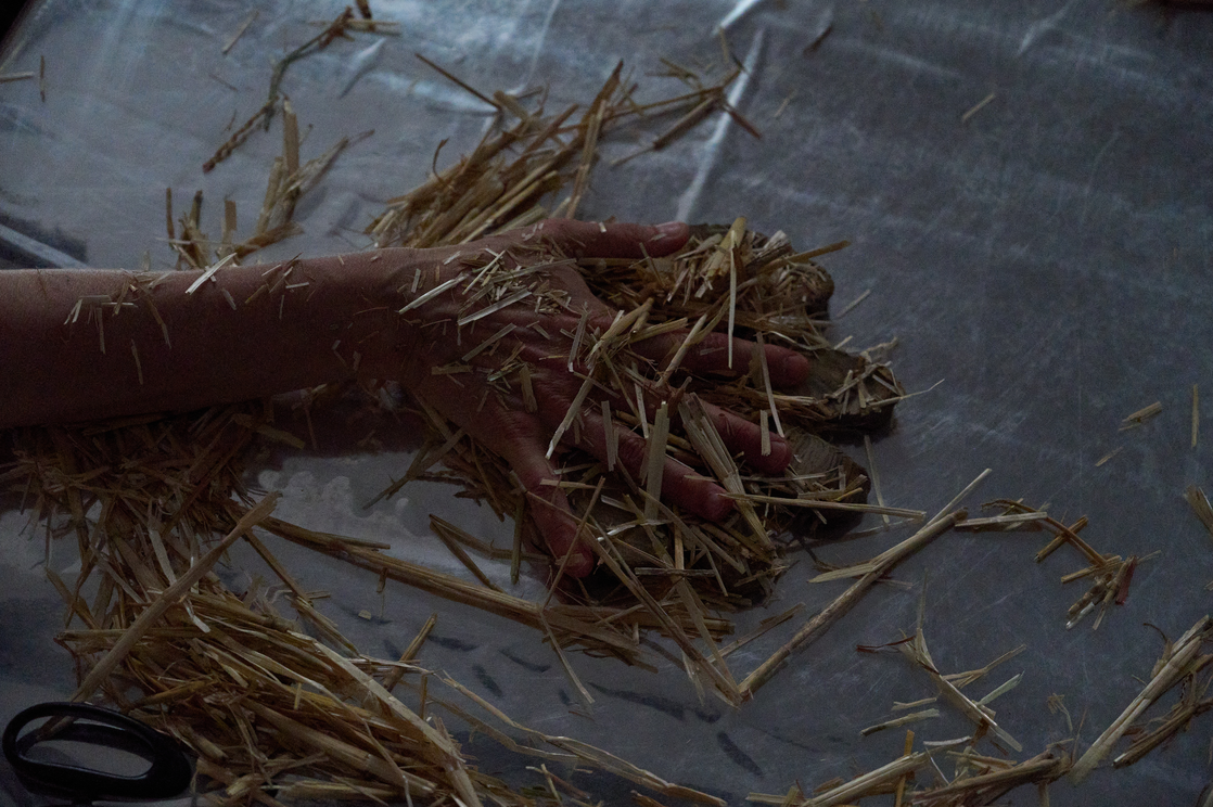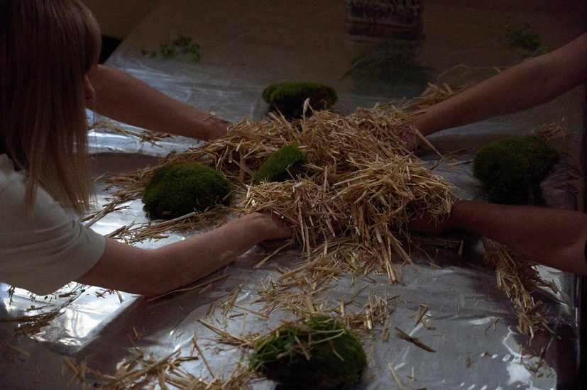 An artistic biotope in the sense of a resident native vegetable world that is neither domesticated nor colonialised nor exhibited as setting nor (over-)aestheticised, which the title of the work already hints at. Analogous to this, the natural materials coming into play and later mostly returned to their natural surroundings, such as straw, branches, moss, herbs, clay and plants, are not to be conceived as props, but as non-human (animate) beings and equal subjects who with their reality / their independent existence enter into a dialogue, or better, a metabolic exchange with us terrestrians.