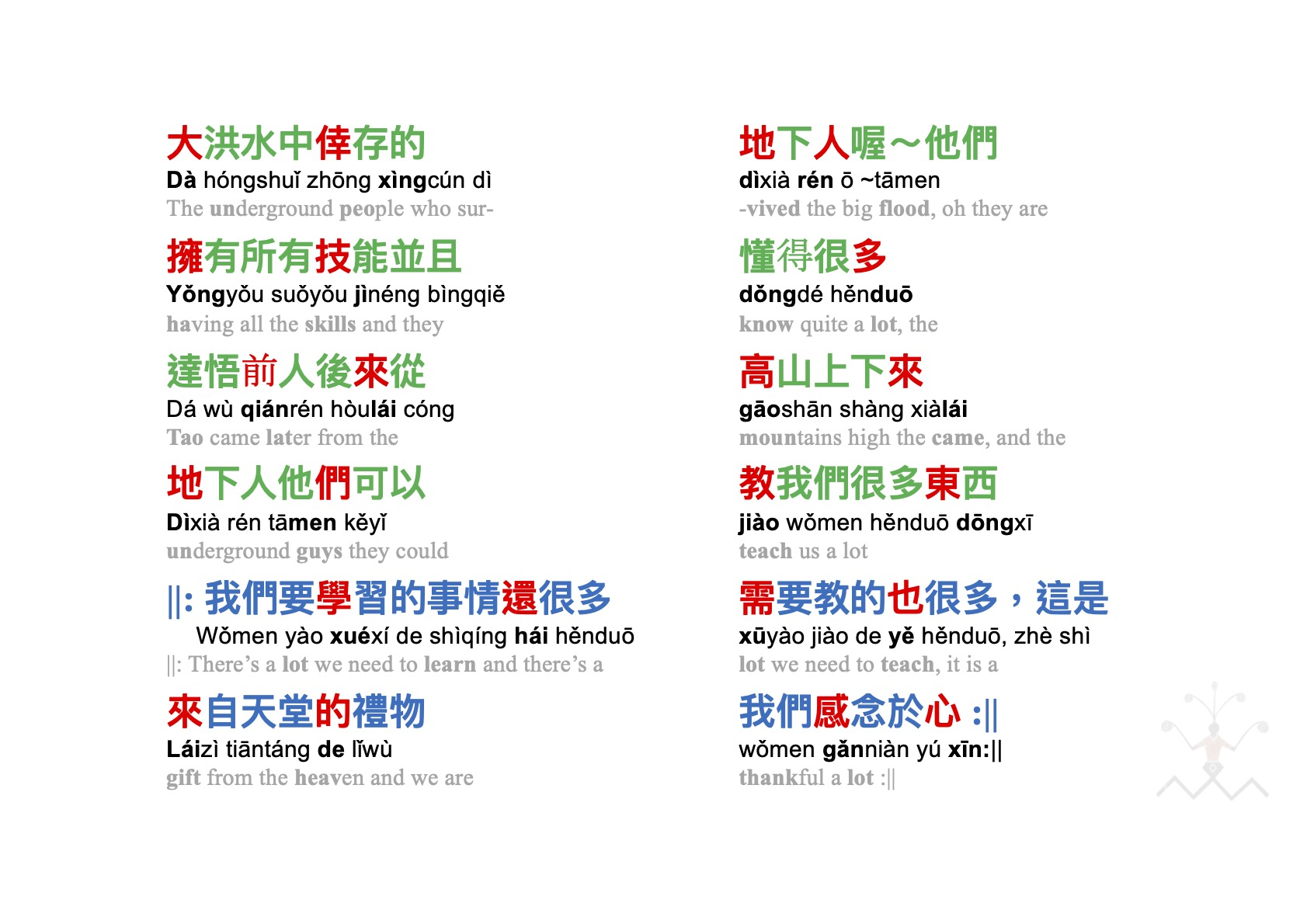 In the example shown here, non-emphasised words in the lyrics are written in green for the verses and blue for the chorus, while emphasised syllables are written in red for Chinese. In the English translation, emphasised syllables are written in bold.