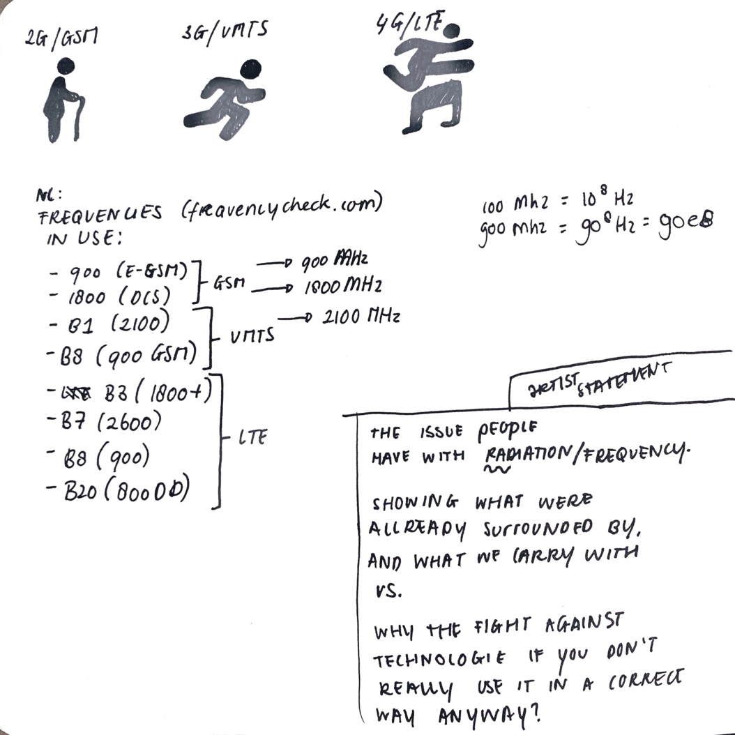 P1V1 is a project that started in my first year at the ArtScience Interfaculty at the KABK in the Hague. Through multiple courses I followed, the electromagnetic spectrum caught my interest, and since the news was talking about the then new 5G network, the frequency of mobile phones seemed like a good start to delve deeper into.