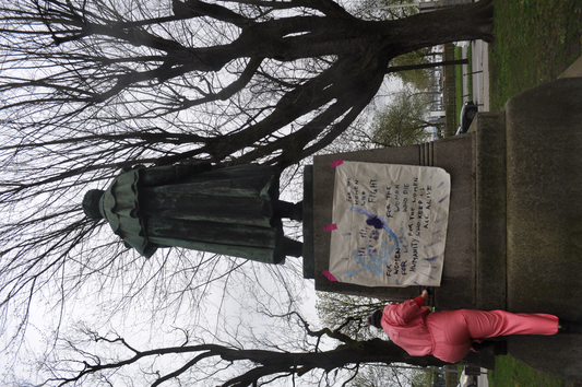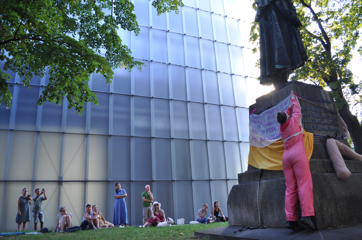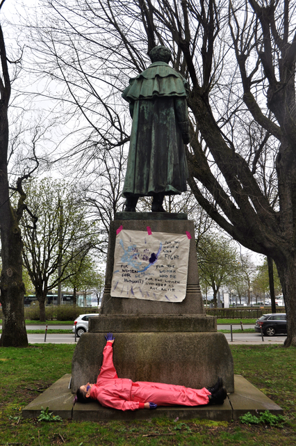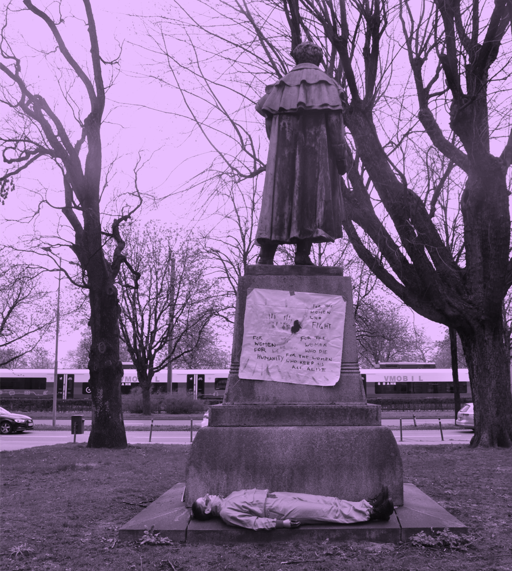 Merging together feminist and performative monumental approaches, FEMonumental Transformance is a method that transforms existing monuments into a contemporary intersectional anti-capitalistic feminist practice of commemoration and representation in public space. FEMonumental practices question not only the monumental practice itself, but especially the underlying patriarchal structures within those practices, public space, society, collective memory and our individual minds. With a ‘feminism for the 99%’ (Arruzza et al, 2022) as their theoretical base, FEMonumental practices consider the overlapping crises of our time and aim to recreate a society beyond capitalism, ecological exploitation, all forms of subordination and human exploitation.