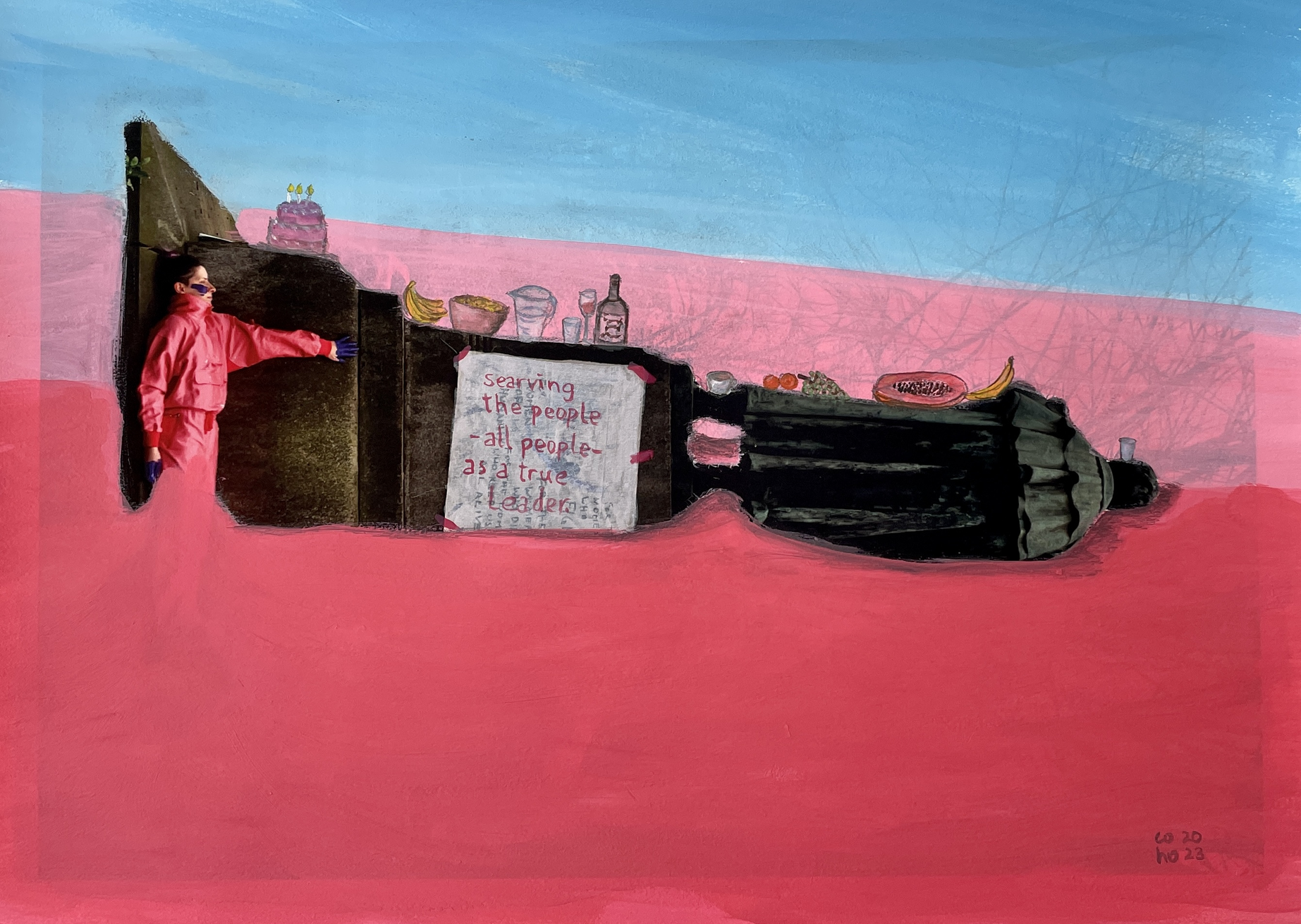 Serving the people. Conni Holzer 2023. Acrylic colour and pencil on art print (Hahnemühle William Turner paper), 30x40 cm. Photograph by Nina Lyne Gangl.