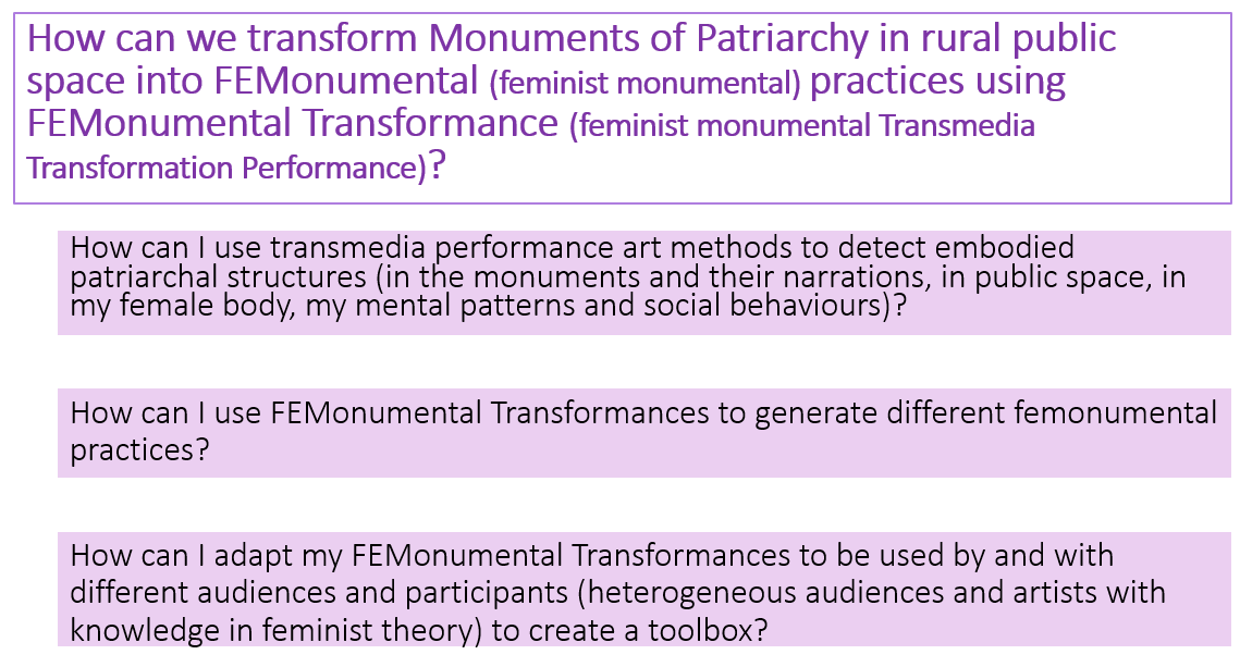 In the first part I elaborate on the term ‘FEMonumental’, merging feminist theory with theoretical approaches towards monuments and public space. In the second part, I explore the term ‘Transformance’ through the terms it is built of – transformation, transmedia and performance, elaborating on the artistic theory behind my concept.
