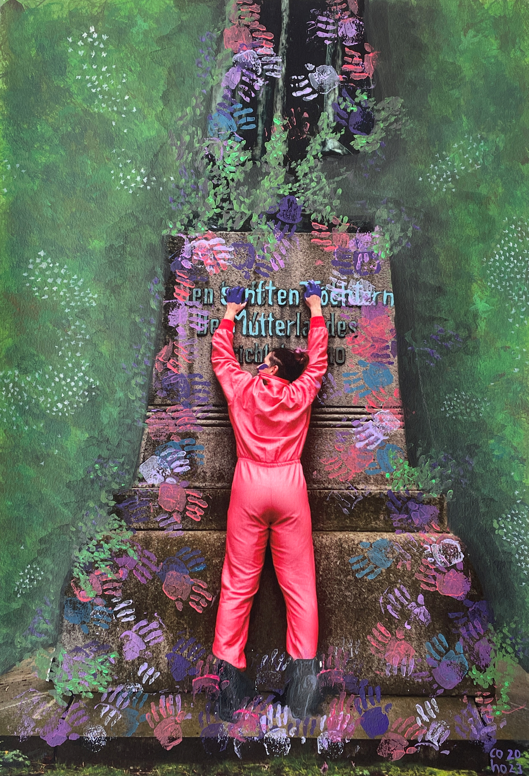 Transformance uses the marked space and other ritual aspects to create a framework for the transformation of social aspects (in this case the patriarchal structures of public monuments). The transformation process doesn’t end with the performance; through the transmediality further aspects and layers are transformed through the exploration of the documentation material of the performance (via video making, writing and overpainting of photographs).