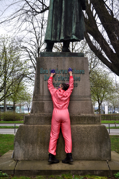 FEMonumental Transformance is an artistic method to transform patriarchal monuments through transmedia performance art into FEMonumental (feminist monumental) practices. It is a confrontation of bodies: of the monument and the female*[1] body in the here and now. It is embodied and visual and changes both bodies through a poetic gesture. The female* body becomes an expression of memory, a performed commemoration and worshipping of an imaginative feminist future. The monument loses its patriarchal predominance over the definition of what is to be commemorated of and worshipped. Through the feminist approach, FEMonumental practices are not just forms of public commemoration and worshipping, but at the same time imagine an anti-racist, anti-homophobic, anti-capitalist feminist future. They detect, disrupt and transform the patriarchal structures, which are still present. As performative monuments, they seek to respond to the need of a materialised, sensible form of history (Widrich, 2023), but use materials that follow a performative, short-lasting, ephemeral approach to reflect the fluid, living and ever-changing characteristics of public space and of history, to prevent any form of domination or hierarchy that excludes people from the public spheres.