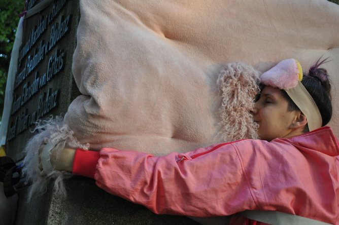 The fluffy softness is a FEMINIST monumental practice, because it doesn’t care about what is considered to be male or female by patriarchal definition. The fluffy softness FEMonument is a FEMonumental practice, a practice beyond the patriarchal hierarchy, where ‘male’ attributes, the state, culture, science, war, power and strength are dominant over ‘female’ attributes like softness, fluffiness, loving, cuddling, nature, peace, weakness, vulnerability and so on. It is a FEMonumental practice because it imagines what could be of importance in a feminist society, in a society without domination based on difference, in a society where love and empathy for all living beings are at the core.