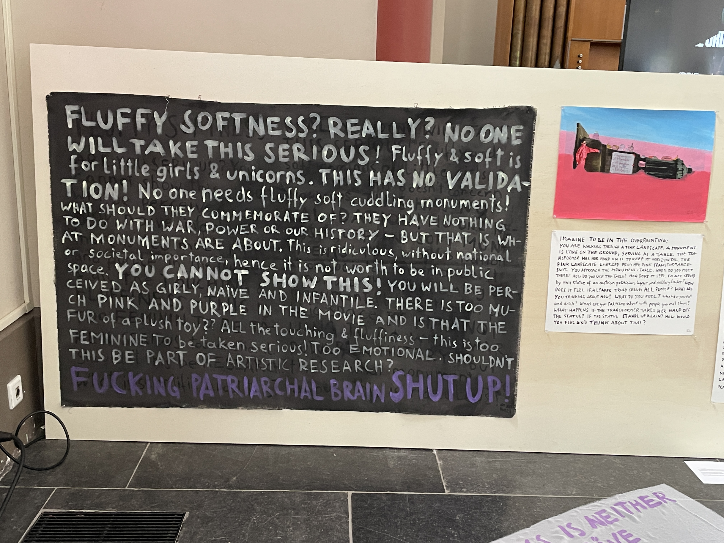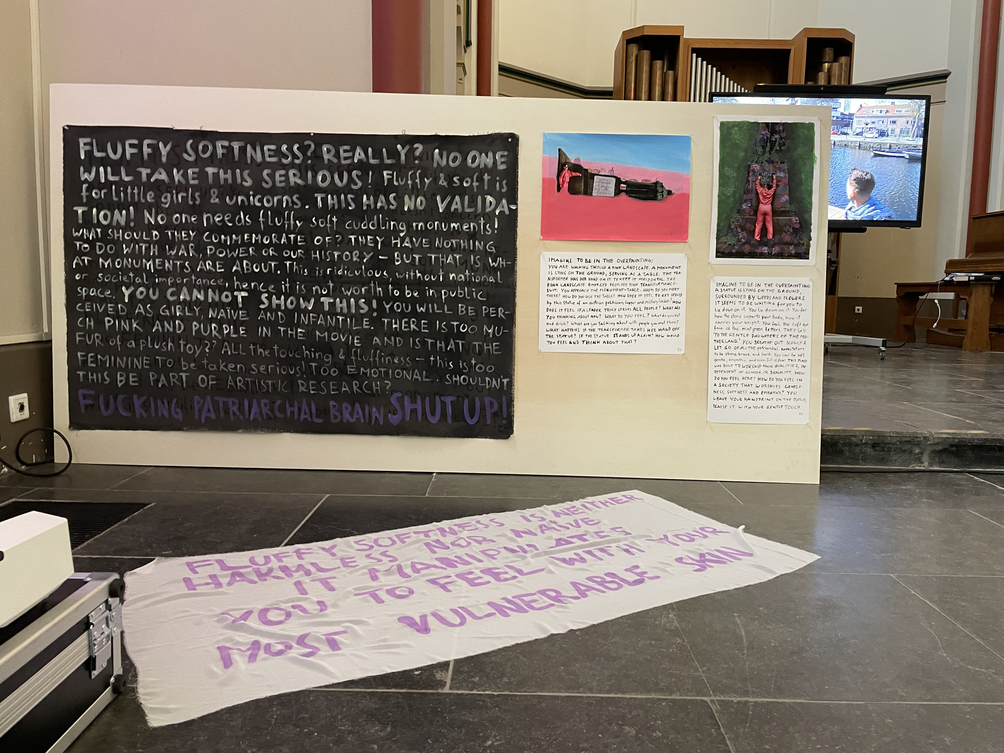 The critical patriarchal thoughts towards the fluffy softness were further used in the Text-Based Paintings and in the Performative FEMonument.