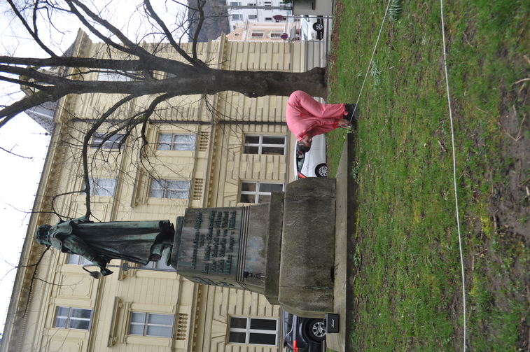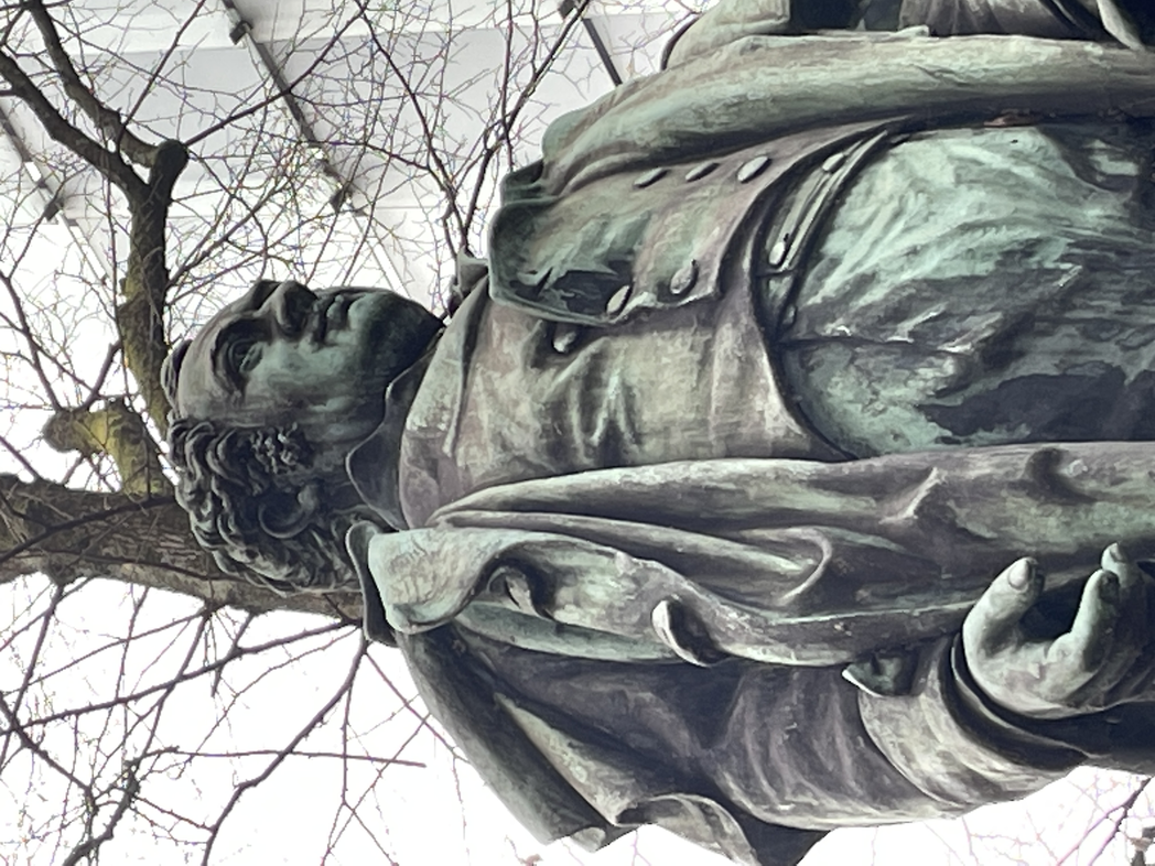It is a cold and cloudy day, with a grey sky and the branches of the trees are empty. I observe the place and the monument. I circle around it and watch it from different perspectives. I read the inscriptions. Anton Schneider appears as an elderly man, half-bold, well-fed, dressed well (1800 fashion) with a long coat, in one hand what appears to be a piece of paper. It looks as if he is about to hold a speech, or give commands. He is looking down on us normal people, from his elevated position in his power-demonstrating posture. There are no arms. But the inscriptions on the pedestal let me guess, that this monument was built to commemorate war actions. The male names on the pedestal are accompanied with military titles and on the back of the pedestal is written “erected to the brave sons of our fatherland”. There are only male names on the monument.