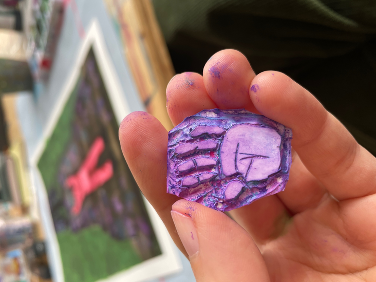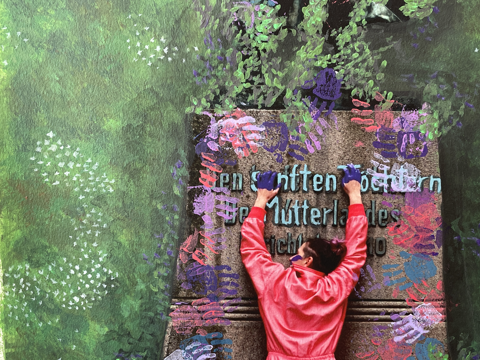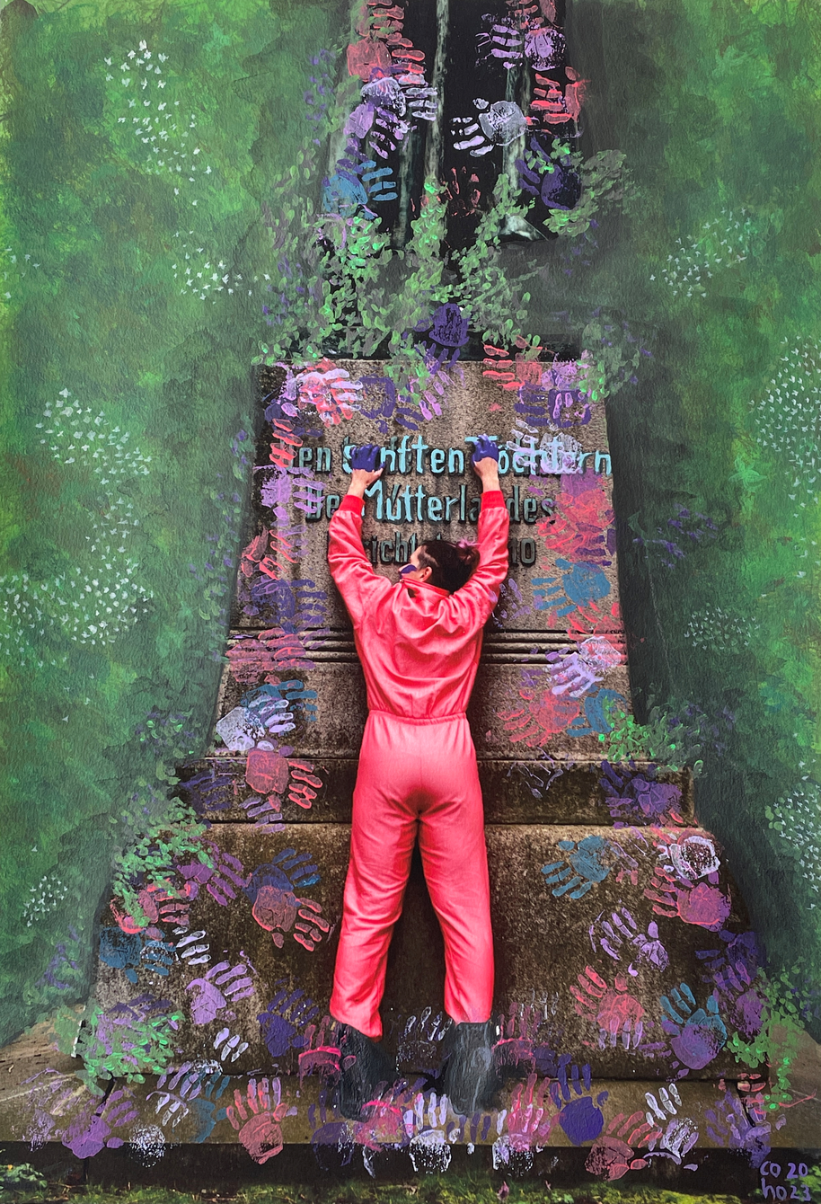A photograph of my body lying on the pedestal of the statue. I paint green around the statue to make it appear to be lying in the grass. I change the words on the pedestal. There is written: “Den tapferen Söhnen des Vaterlandes erbaut 1910” (To the brave sons of the fatherland erected 1910) and I change it to “Den sanften Töchtern des Mutterlandes …” (To the gentle daughters of the motherland …). I want handprints on the statue. I want people to touch it and leave their marks. I make a linocut of a tiny handprint and print with it colourful handprints all over the statue.
