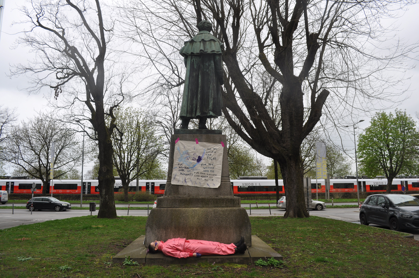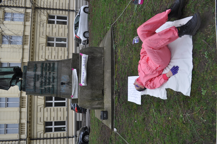 I look at the overpainting. It appears like a gravestone, a place to mourn with the body lying on it, appearing kind of suffering. The handprints on the statue symbolise that people were paying tribute to the monument, to someone represented by it. I don’t see the man in the statue. Only the feet and part of the cloak are visible, which is gender-neutral or even seems to be feminine. The “new” words on the pedestal make it a monument dedicated to daughters, women, to the motherland, to gentleness. What are “gentle daughters of the motherland”? I associate it with a monument for sensitive women, for daughters who were lost, who suffered because they are too sensitive and gentle for this patriarchal violent world. With the handprints, it symbolises touch – how people touch the monument, connect with it, be soft and gentle with it. The monument stands for support for women and daughters, support for soft, gentle, sensitive people, worshipping soft, gentle and sensitive people.