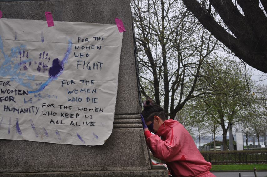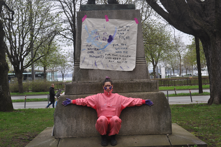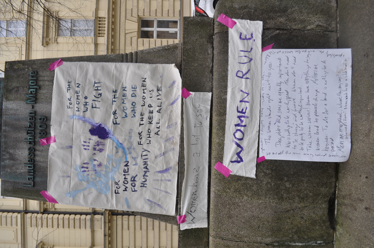 I looked up at the monument and thought about the men who go to war, who send other men into war and it made me sad. I thought about those men and that if they would have gotten enough love in their childhood, they would not feel the urge for starting wars… Then I thought: I am thinking about men again. But I don’t want to. I want women to be at the centre. What if we build monuments for the women who fight? All those feminists who get killed or experience violence because they are feminists? All the girls and women in Iran who are fighting and risking their lives for their basic human rights? So I started to draw on a piece of cloth and wrote on it “for the women who fight. For the women who keep us all alive. For women. For humanity” and I hanged it onto the monument, covering the names of the men.