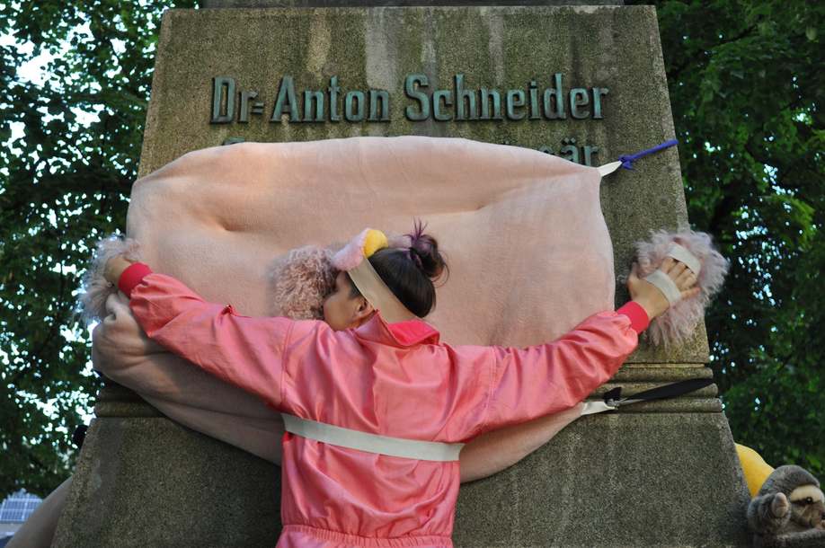 I started with the decision to focus on fluffy softness as FEMonumental practice and I started to create soft fluffy objects to perform with and to install on the monument. While sewing, I thought a lot, I started to perform and move with the objects and tried them out on site with the monument. I tried to figure out, what I want to commemorate of through the fluffy softness as FEMonumental practice. Do I need something “specific”? Should I ask the audience members for what they would use it to commemorate? Or is it simply to honour and represent attributes that are defined and devalued as feminine? I went for the last.