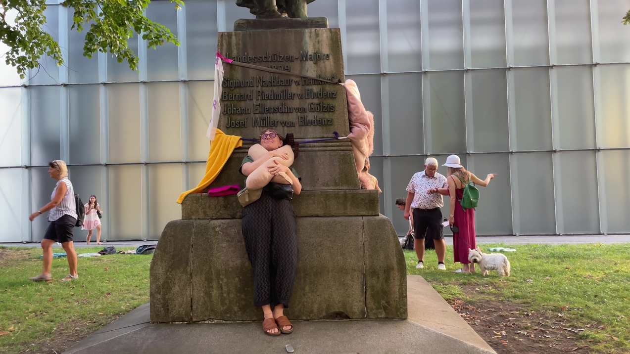 I tried to make it very clear what the performance is about (in the talk of the statue at the beginning). I had to shake that anxiety off and to go back to just do it, just try it, just start somewhere. And that worked. I improvised some parts of the performance, like I started to “fight” the monument during its critique of Fluffy Softness with the soft and fluffy objects, with hugs and cuddling. It got funny and absurd, playful, but kept the serious and concerned tone in the end.