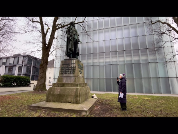 The statue stands on a pedestal, pedestal and statue each about 2,5 m high. It is located in the middle of a square green island, with a big tree in each corner. The grass is surrounded by streets, which are mostly used as parking and to access a bigger parking. Pedestrians use the roads to cross between the buildings, but it is no main route for pedestrians. The statue faces the main road along the lake, behind the road the promenade with the harbour and the Lake of Constance. Behind the statue is the backyard of a restaurant, on its right side the main post office, on the left side the Kunsthaus (museum for contemporary art). From the monument, you see the sides and backsides of the surrounding buildings, no entrances.