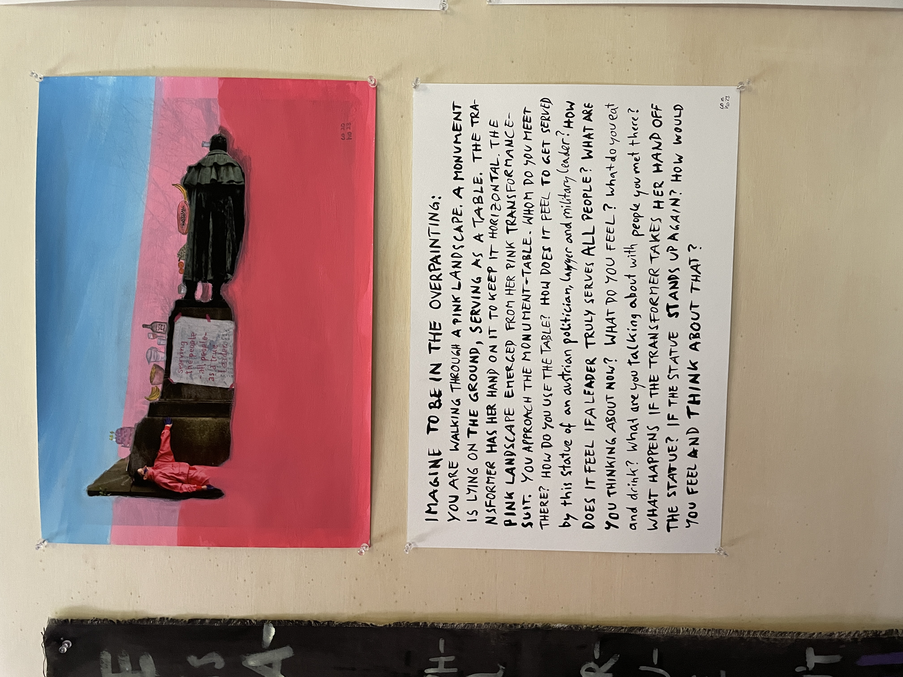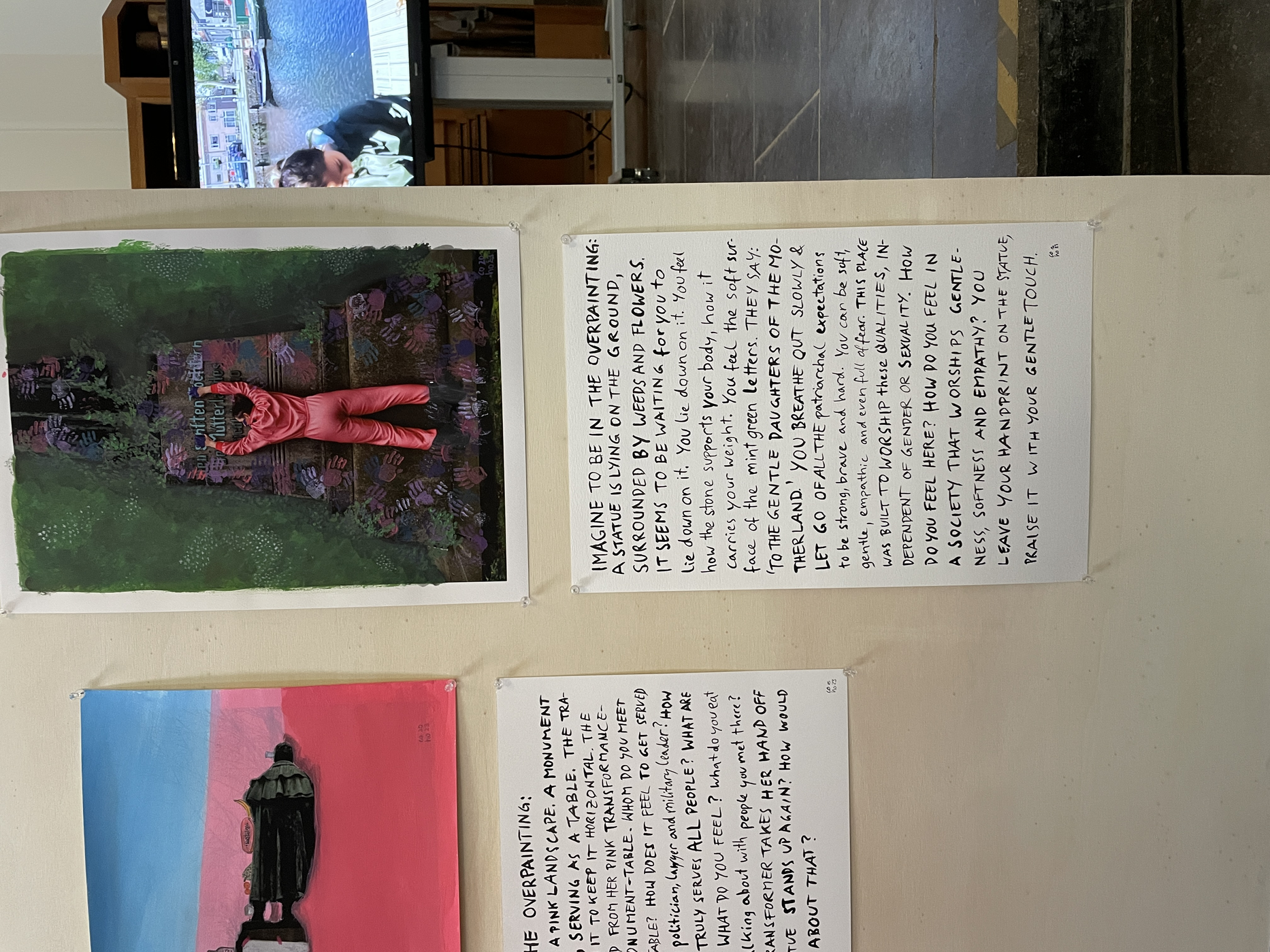 The text-based paintings that belong to the overpaintings are painted with acrylic colour on paper of the same size as the overpaintings. The texts emerged from the painting process, where I used writing to elaborate on the FEMonumental ideas. They ask the audience to imagine to be in the overpaintings, to imagine how a world around these FEMonumental practices would look like.