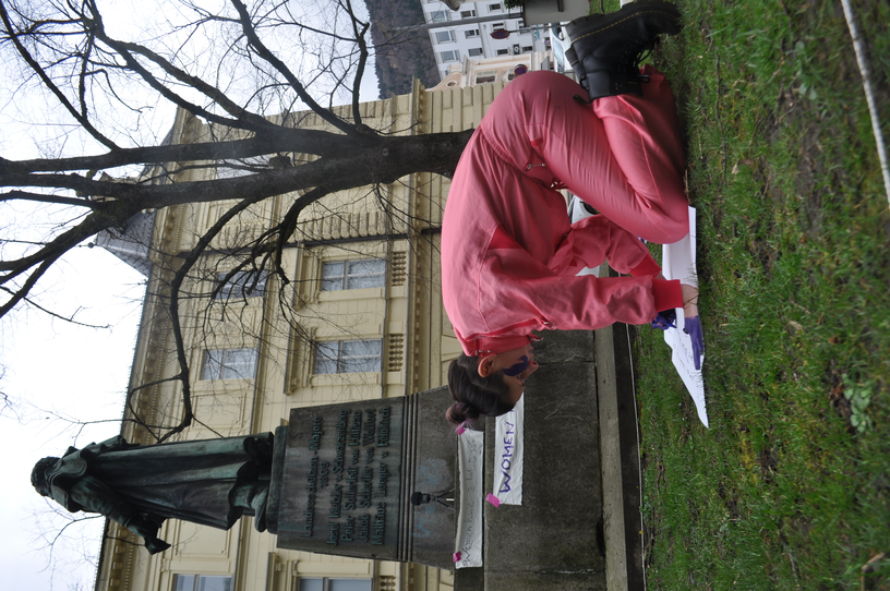 Then I started to put my things together and we made photos. I put my body in relation to the monument, I pushed it, I looked at it, turned my back to it, climbed it and hanged the “for the women” piece higher on it, I sat in front of it, lied down to it.