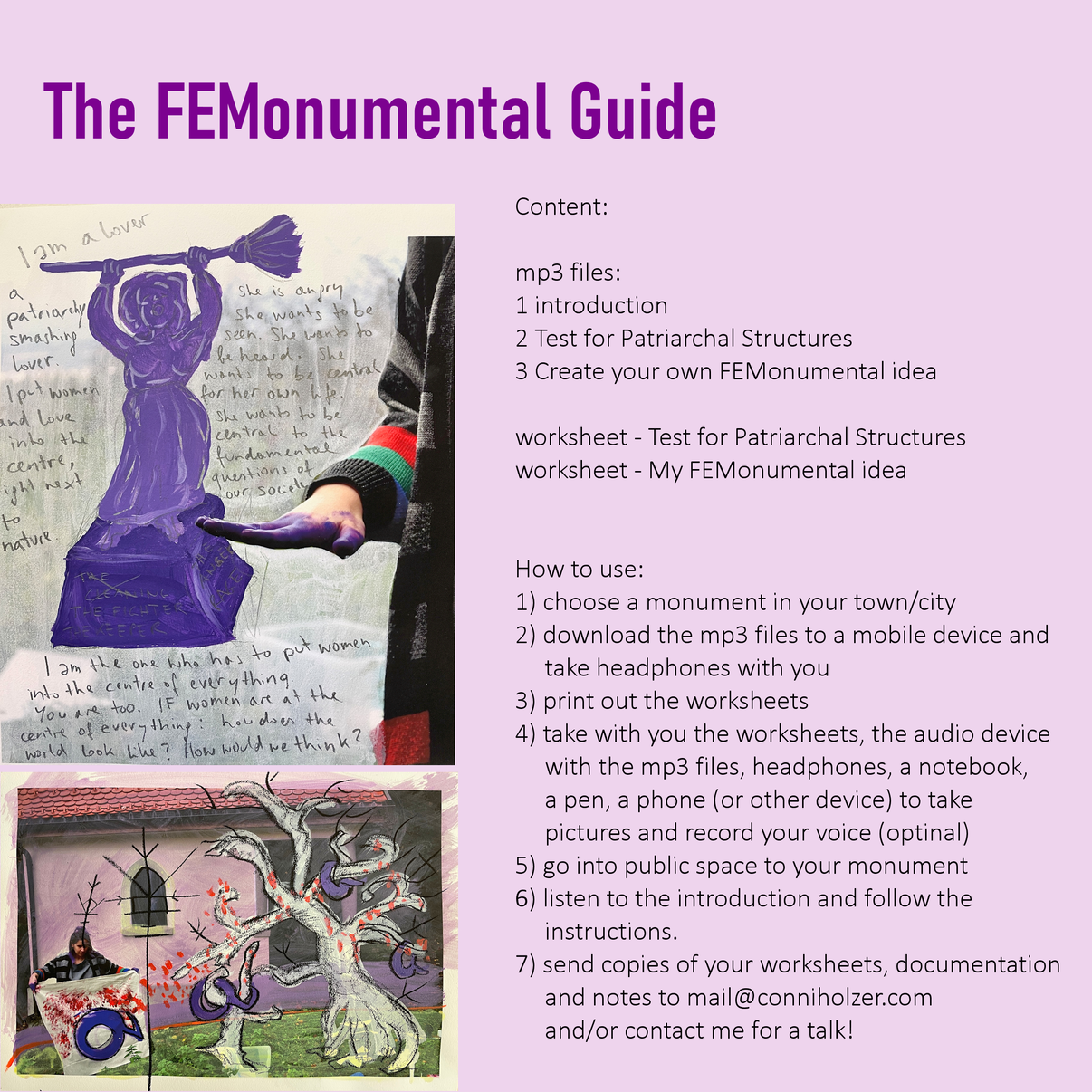 This guide is part of the Master Project ‘FEMonumental Transformance in Rural Public Space. A Transmedia Performance Art Method to transform Patriarchal Monuments into Feminist Monumental Practices.’ by Conni Holzer, Master Performing Public Space (FHK Tilburg).