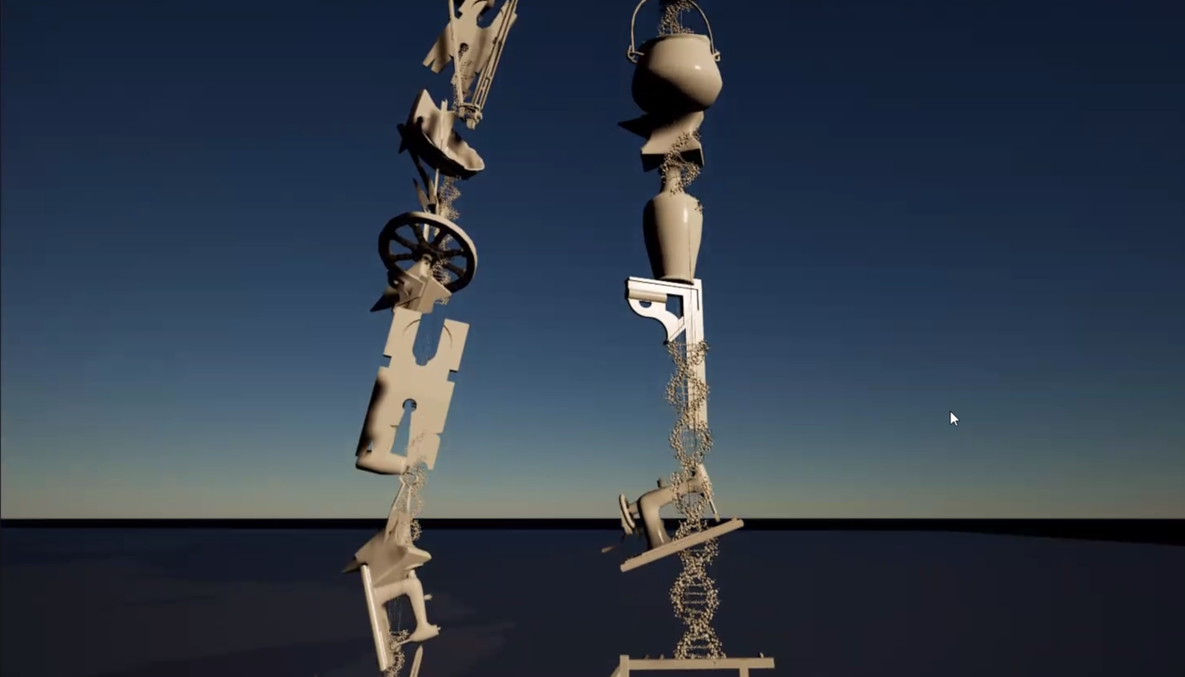 In the VR world we created, towering sculptures made up of tools dot the landscape, symbols of our criticality of equipment and devices. We mixed tools that we use for crafting—such as looms, kilns, measuring apparatus, spindles, pinchers, hammers, and bobbins—with tools for digital production—like keyboards, headsets, controllers, and headphones. We threw scale to the winds, sizing up or down enormous and tiny objects. We stacked them willy-nilly, playfully conflating, intersecting, and juxtaposing disparate artefacts. We stripped them of their material appearances, blanketing them with a beautiful but simple porcelain appearance. And in this way we signalled how attached we are to the tools themselves.