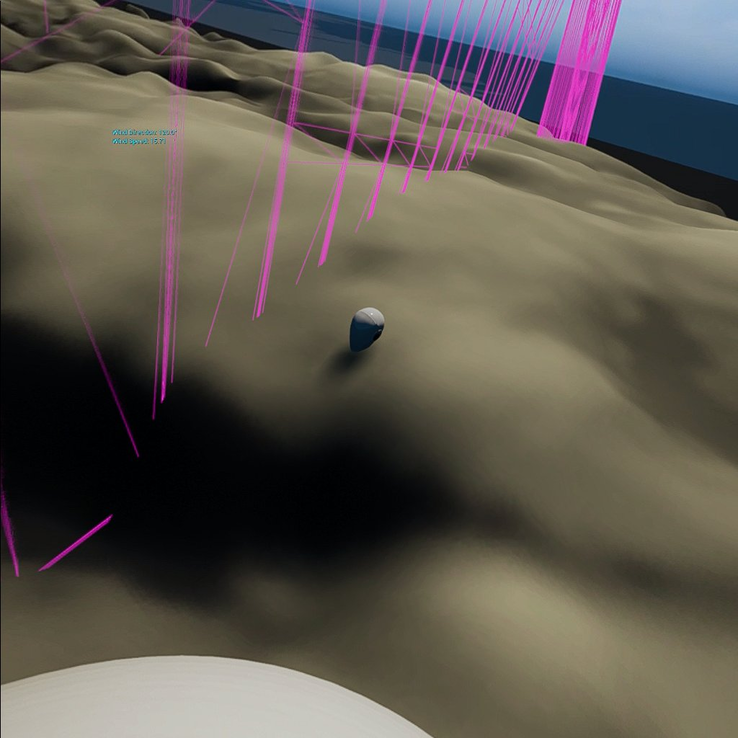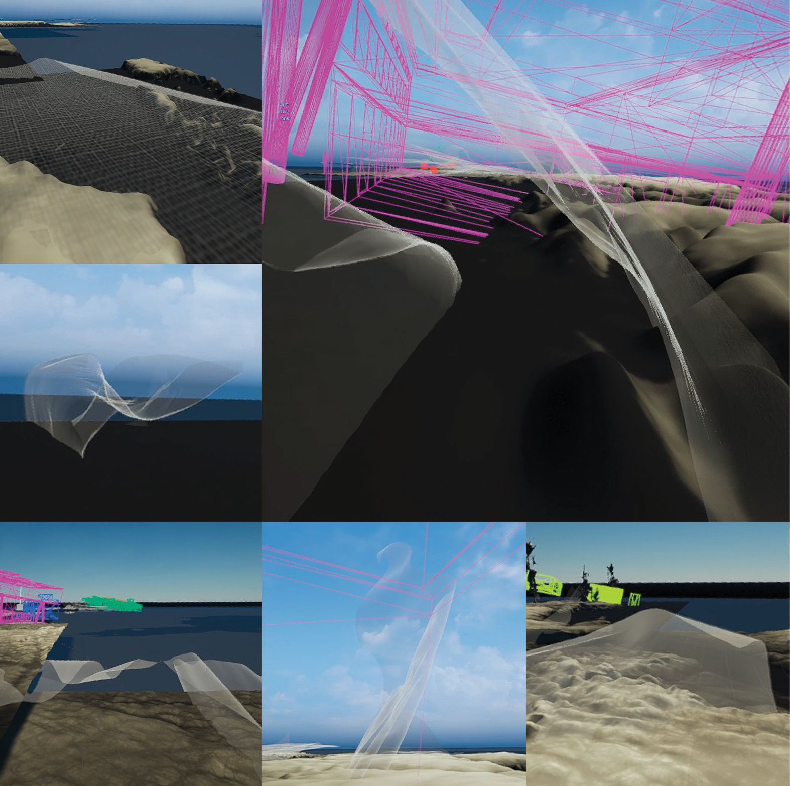 When we put on the headset to look at the world we were creating, we couldn’t find the mannequins. But we did see odd artefacts on the landscape and falling through the air. We hadn’t realized that the wind that was blowing our fabric was also affecting the mannequins. Much to our dismay, their bodies had been twisted and contorted by the wind. The work already had an uncanny, dystopian aura to begin with, but with the addition of mutilated bodies it was pushed over the edge into horror—not what we were going for. The mangled bodies did not make it into the final version.