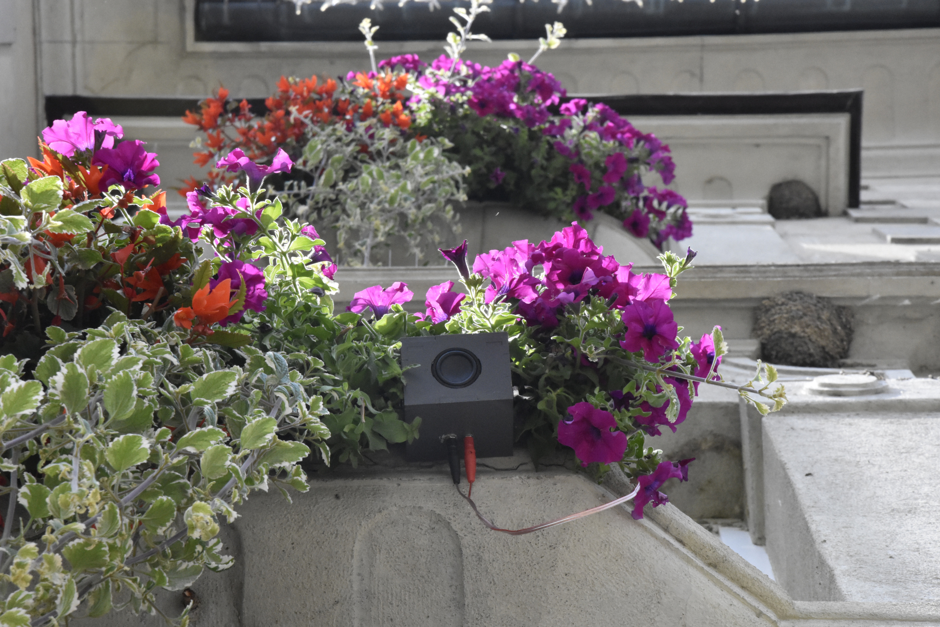A first ecological aspect concerns how Trópos relates with, and integrates in, the acoustic environment that welcomes it. Trópos is primarily conceived as a sound piece for public spaces. Public spaces are very different from more traditional exhibition spaces. A first, obvious difference is that there is no "silence" in a public space. The acoustic environment of, say, a public square is populated by the sounds of birds chirping, people chatting, kids playing, cars passing by and so-on. Listen, for example, to sound recordings from Gleisdorf Hauptplatz. In such a situation, special attention must be given to how the piece acoustically integrates in a soundscape which is already relatively crowded. In Trópos this integration was mainly developed through an aesthetic reflection on 1. the timbral and temporal qualities of the sounds processes involved 2. the acoustic interaction these processes have with the soundscape around them.
