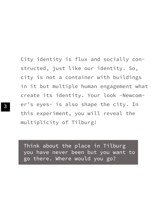 City identity is flux and socially constructed, just like our identity. So, city is not a container with buildings in it but multiple human engagement what create its identity. Your look -Newcomer’s eyes- is also shape the city. In this experiment, you will reveal the multiplicity of Tilburg!