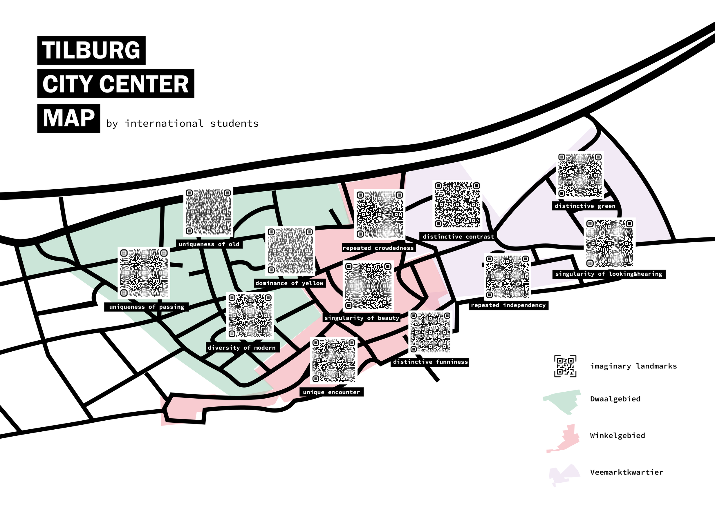 I anchored drawings in the most striking points based on participants’ narratives in the public space, and embedded the films into QR codes. I placed QR codes in situ. They represent the imaginaries of international students which are repetitive, dominant, singular, unique, distinctive, and diverse imaginaries in these locations. And I used relationality in psychogeographical narratives to name these imaginary landmarks.