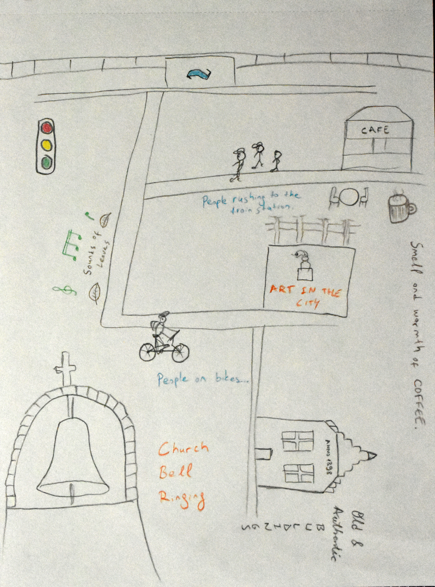 The sound of the church bell, together with the sound of the leaves moved with the wind in the street. He saw the old buildings. Interesting. He saw people rushing to the train station. The train station has a huge logo in the city. In the middle of the city. What is on the other side? Where does the train track go? He saw the families.
