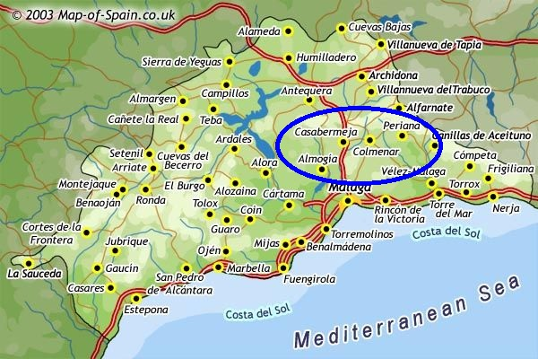 Image 1. Surrounded in blue, the predominant area of verdiales in Málaga. Map of Málaga by Tourizm Maps, 2003. Retrieved from: https://www.map-of-spain.co.uk/large-map-of-malaga-region.htm. Last visit: 19/11/2022