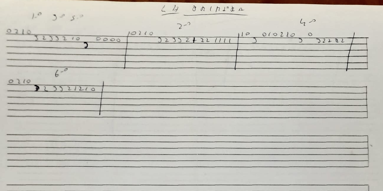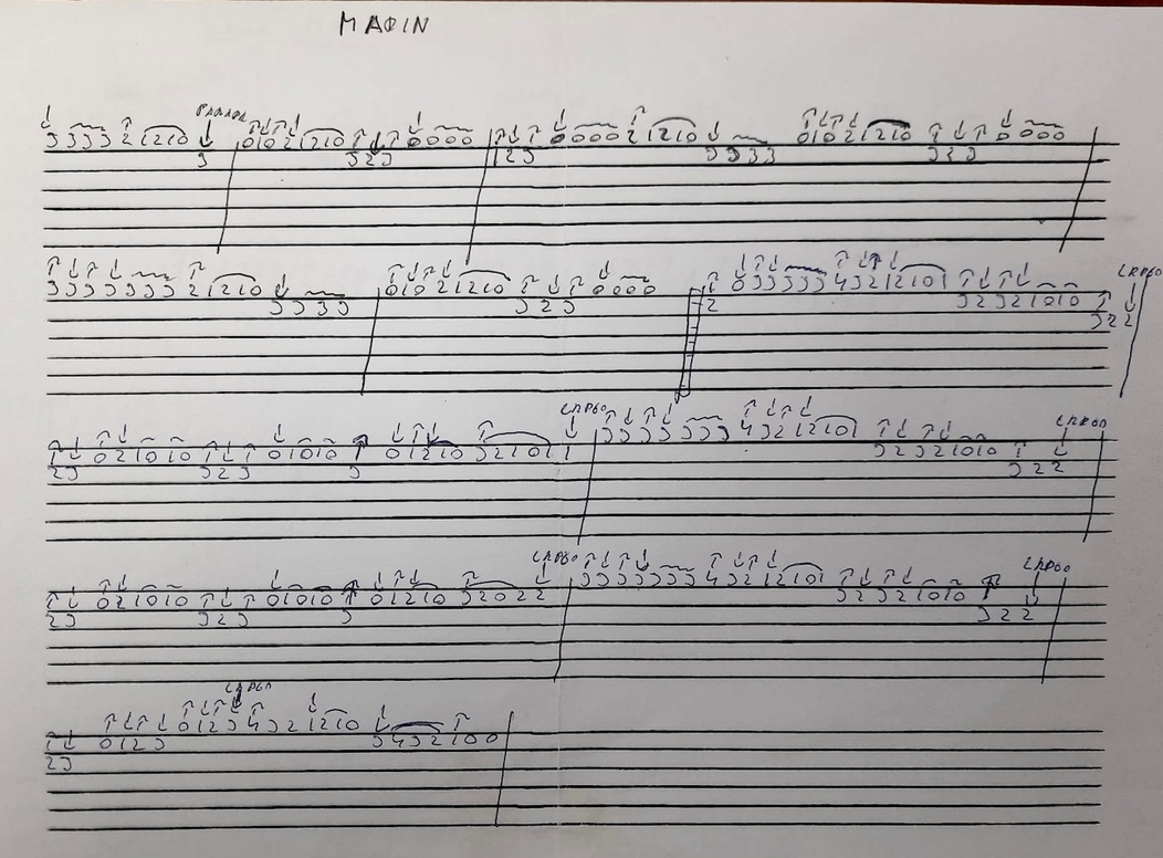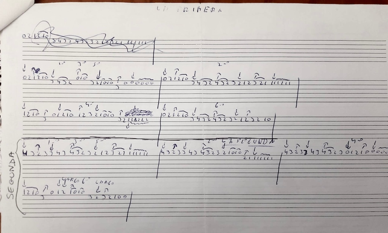 The idea he had was to designate with numbers from 1 to 4 the different fingers (as fingerings in classical music), and to write those numbers in the different spaces of the pentagram depending on the string to be played: above the first line, E string; first space from the top, A string; and second space from the top, D string. As it has been mentioned before, the G string is never used in verdiales.