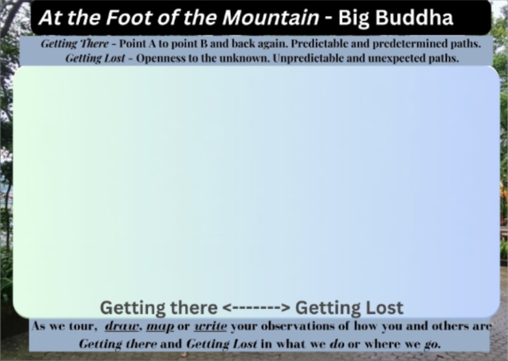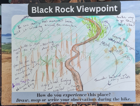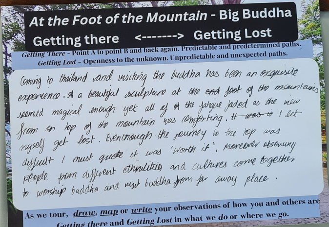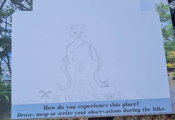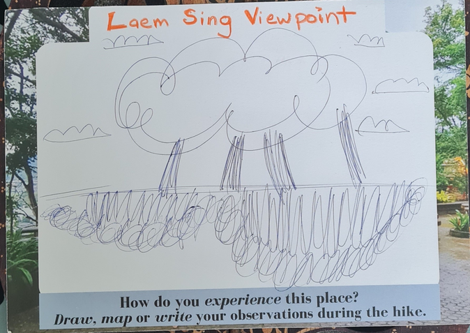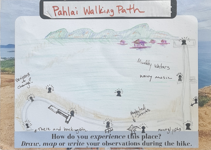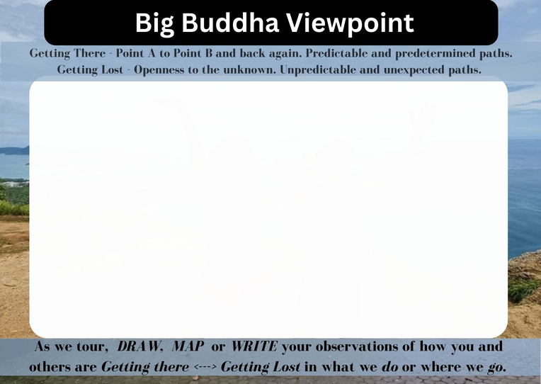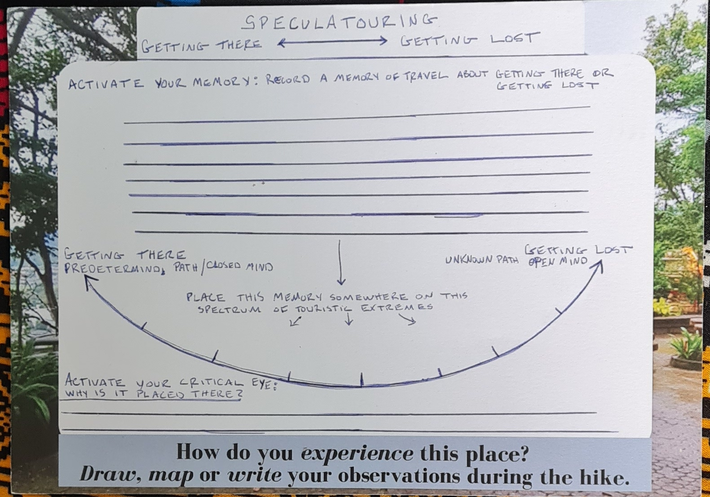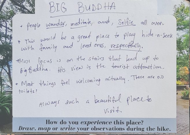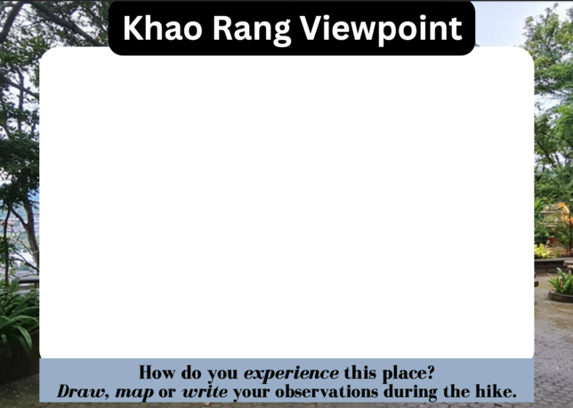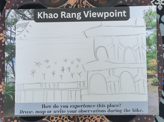 I wanted the front side to represent the reality of the place (like a traditional postcard) so I included local viewpoints in Phuket for the titles, as well as, photos I had taken at those locations to use as the background. In the center, a big blank space is included and intended for participants to create their own unique "image" of the place through their writing, drawing, and/or mapping of their observations.
