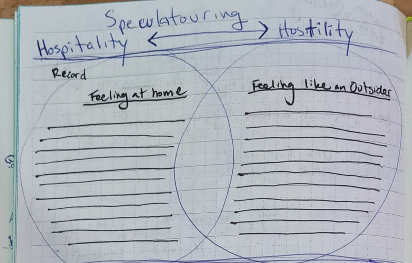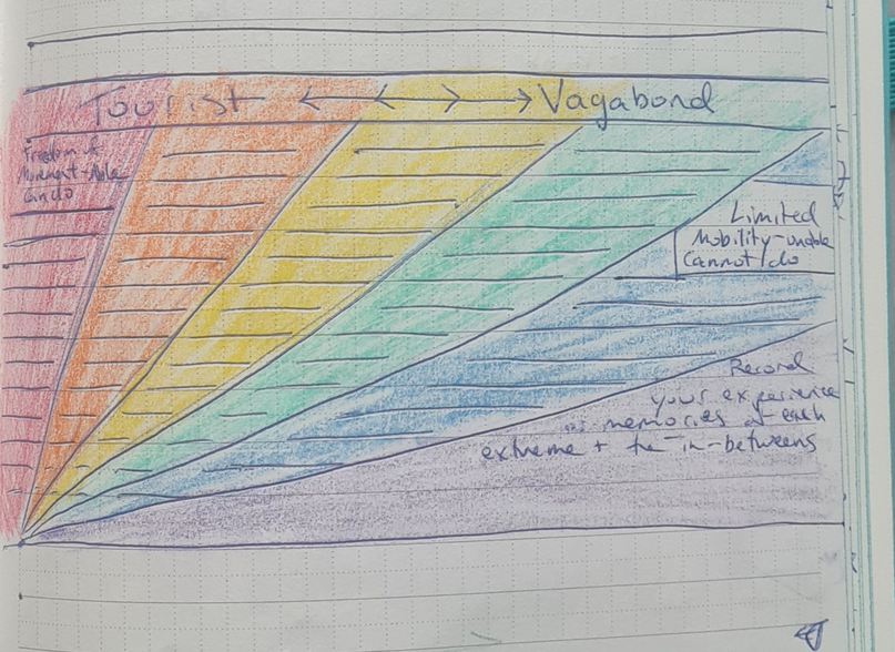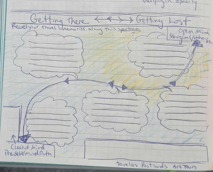 I initially worked with prompts around memories of travel, using sensory exercises and questions to access and record memories within a given spectra of critical tourism.