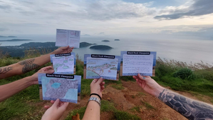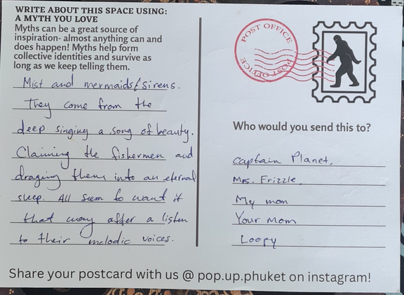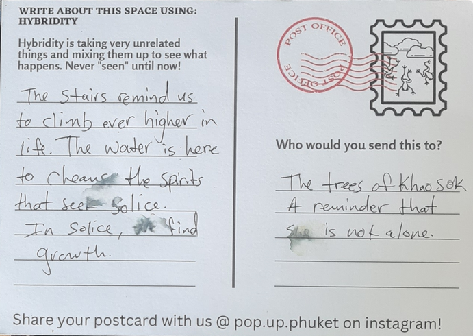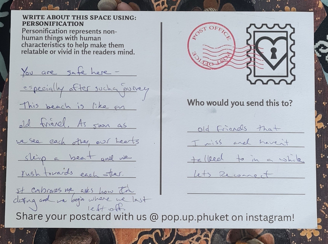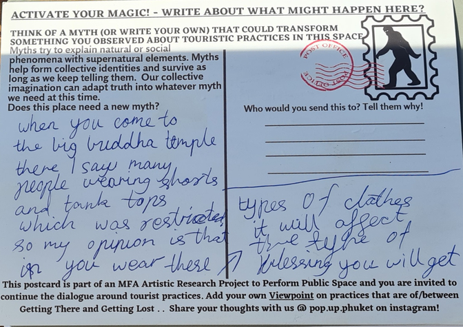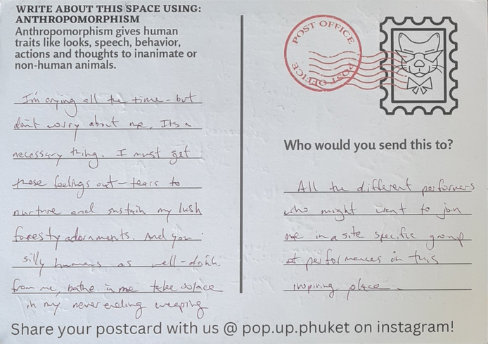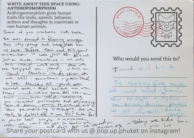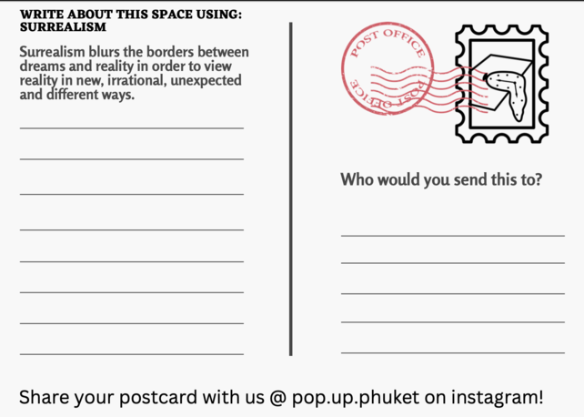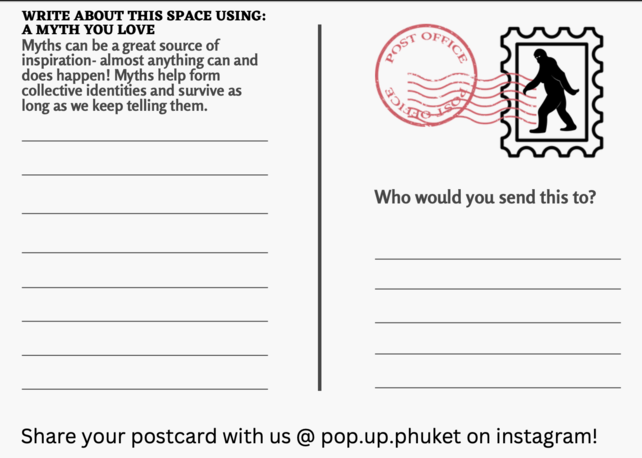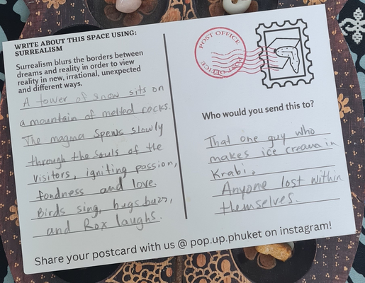 Storytelling postcards were designed as an interactive tool for participants to use for writing practice with the literary techniques of magical realism chosen for the project. This writing form was inspired by the various visual storytelling tools and creative practices explored by Galvan and Spasojevic for Mapping Nottingham and from a suggestion from my coach Heleen de Hoon. Intuitively it felt like an appropriate, relevant, and practical tool for writing in a touristic place like Phuket. It could function as an interactive tool for the art experiences I was devising. A souvenir of the experience both locals and travelers might be able to connect with and share.