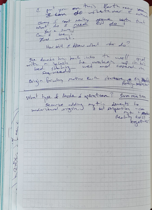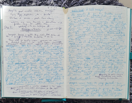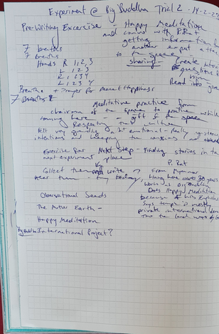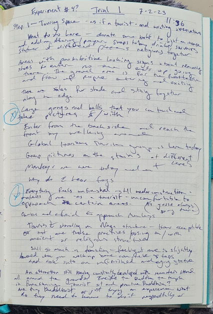 Step 2: Find a spot that feels good for writing. Set up a video camera, with a view of myself and as much of the location as possible, to document the writing process. Test out the technique of magical realism to create story fragments in relation to the space and what occupies it. Use the observations gathered as seeds to inspire playful writing with each technique. Test out one technique at a time for each experiment. Give the technique a full investigation for 30-60 minutes.