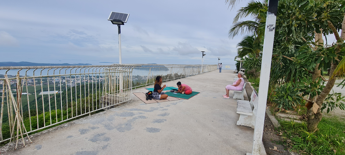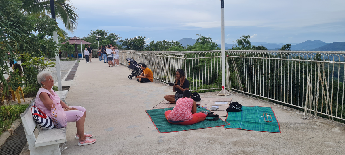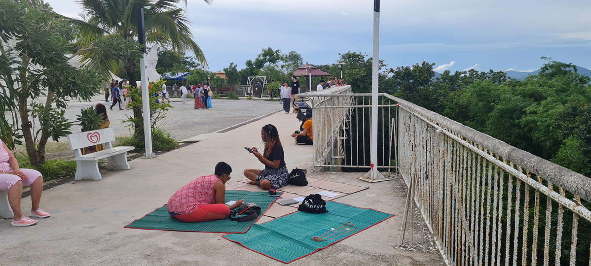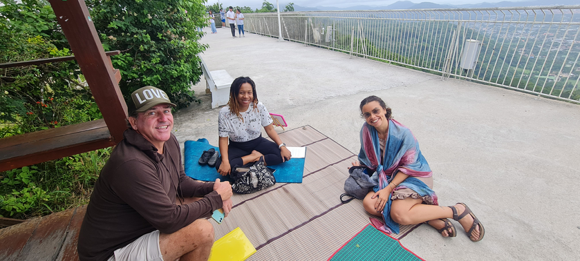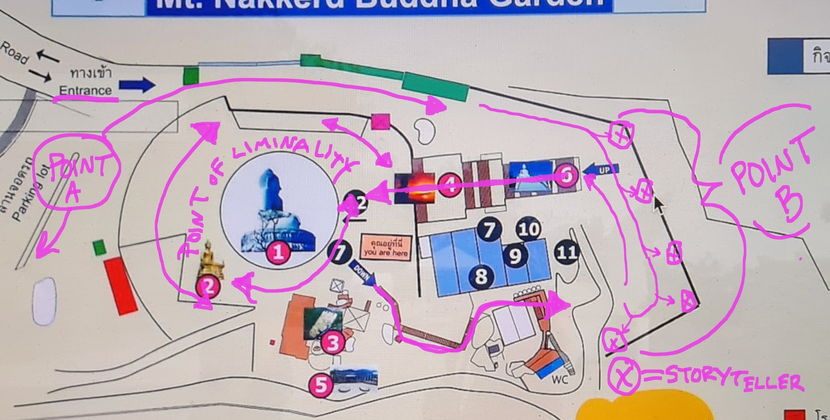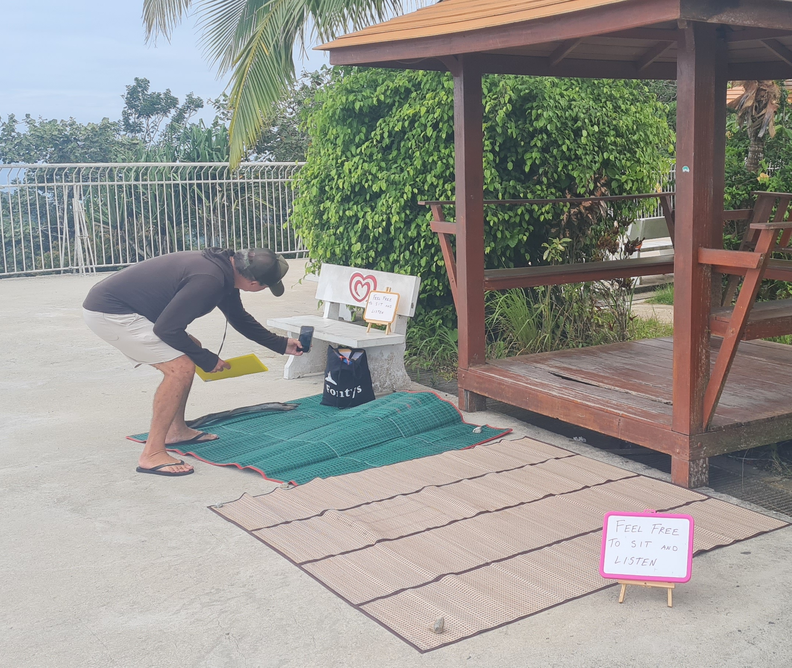 For the staging of the engagement, the viewpoint area would be used for storytelling installations because of their traditional designation as public spaces for communities to meet and exchange. The spiritual space of the Big Buddha temple area would be positioned as a personal area for writing and touring practice, so as to not disturb or disrespect other practices there with my stories. Thai woven mats were utilized for framing an inviting area for audiences to sit and listen to stories because of their recognizable function here in Thailand for relaxation and meeting in public. Mats would also be positioned near benches and pagodas to help encourage more audiences to join. Signs were used again to invite passers-by to join. This engagement is still being developed and attempted and requires further practice to understand its potential.