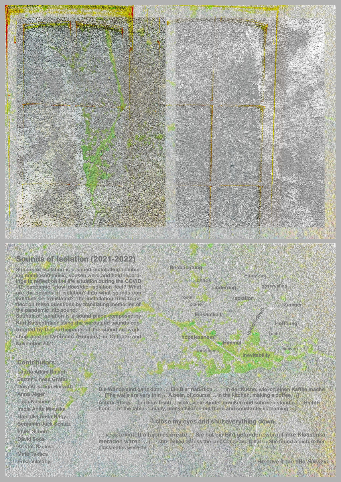 Sounds of Isolation combines composed music, spoken word and field recordings to reflect on the life situation during the COVID-19 pandemic. The work also includes a parallel visual text. A sound art workshop held with students at the University of Debrecen (Hungary) in October and November 2021 formed an important part of the creative process. During the workshop participants were asked to use words as single descriptors of feelings as well as narration. Here Katschthaler was above all interested in sound, i.e. in how words or narratives were recited, in pitch, tone, voice. In the composition, words and narratives are mixed with everyday sounds recorded in workshop participants’ homes as well as with sounds the artist had recorded in the empty university building during lockdown. Both in the process of creating the piece as well as in the final work, sound overrides the more literal content of words. Katschthaler explains how sound provided a more direct way of allowing students to remember and to share their memories of lock-down. The final artwork gathers the different memories, voices, experiences and translations and remixes them into an oppressive, repetitive and, at the same time, hypnotic acoustic atmosphere, which must be experienced in isolation, but which can also be seen as shared.