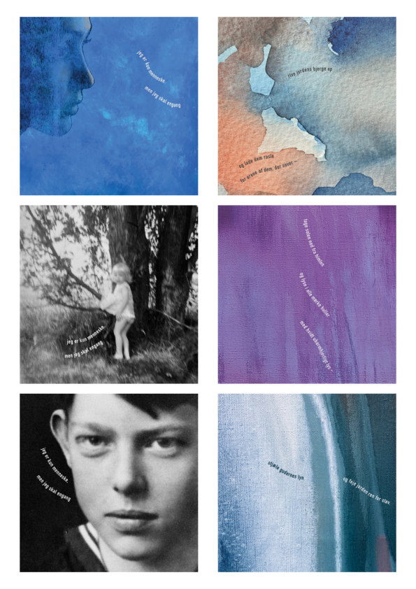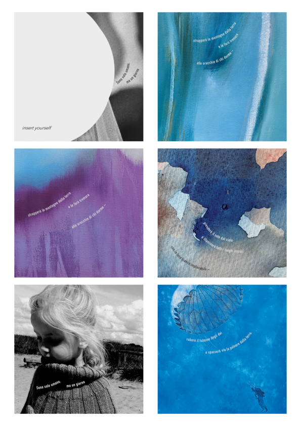 For this installation Sophie Clausen and Manuela Perteghella translated the poem 'Ideal' by Danish poet Gustav Munch-Petersen (1912-38) into an interactive collage consisting of visual (photographs, painting, collage) and linguistic (English and Italian) translations and recordings of the poem in Danish (recited by the poet’s daughter), English (recited by Clausen) and Italian (recited by Perteghella).