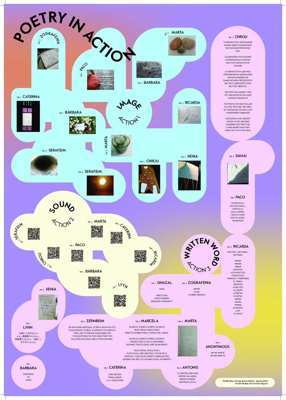 Scott's 'proliferation of text in performance' can be seen as almost programmatic for Marini and Díaz-Vicedo's Spiralling Words: Πoesia en acció, which consisted of two processes and two outputs: a poster, which also works as a gateway to diverse creative translations and a 20' performance, which features some of these translations. For the online exhibition the performance is represented by a 6-minute video.