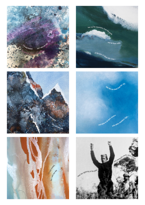 While each of the 18 panels contains a passage from the poem, the panels are not illustrations of these particular lines but rather ‘transformations’ of what Clausen and Perteghella identified as 'the atmosphere’ of the poem, the fragility and resilience of ‘being only human’. Both translators and the poet are prominently visible in the installation, which includes photographs of the poet as a young man, of Perteghella as a bride (removed in the virtual version to make space for you, dear viewer/participant), of Clausen as a child and of Clausen’s daughter.
