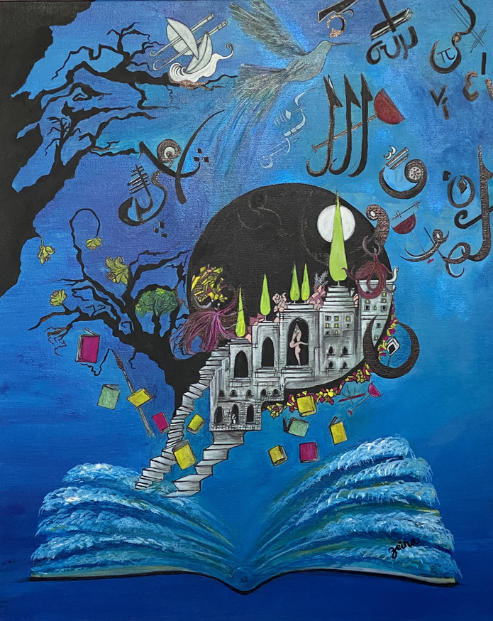 After sketching the associations in particular groups of words, Dghaim chooses one that most represents it and starts painting. Here, her process involves experimentation with various perspectives and compositions while being guided by the restraints imposed by the words. At the same time she is conscious that her painting is just one of many possible interpretations, which can (and should!) be re-translated ‘over and over again’.