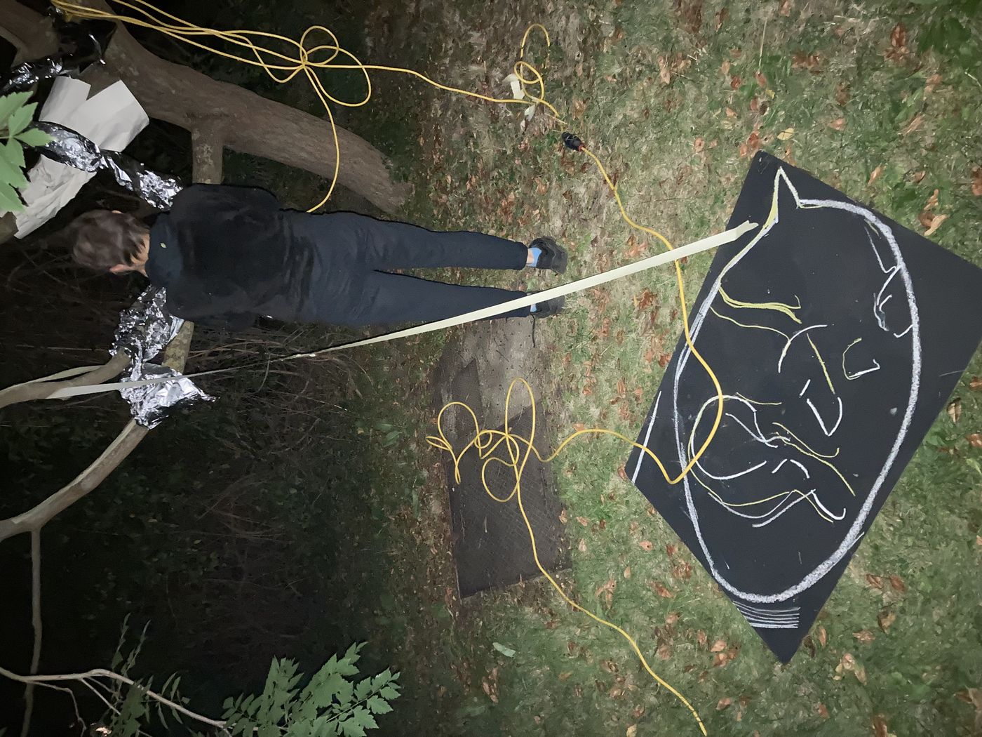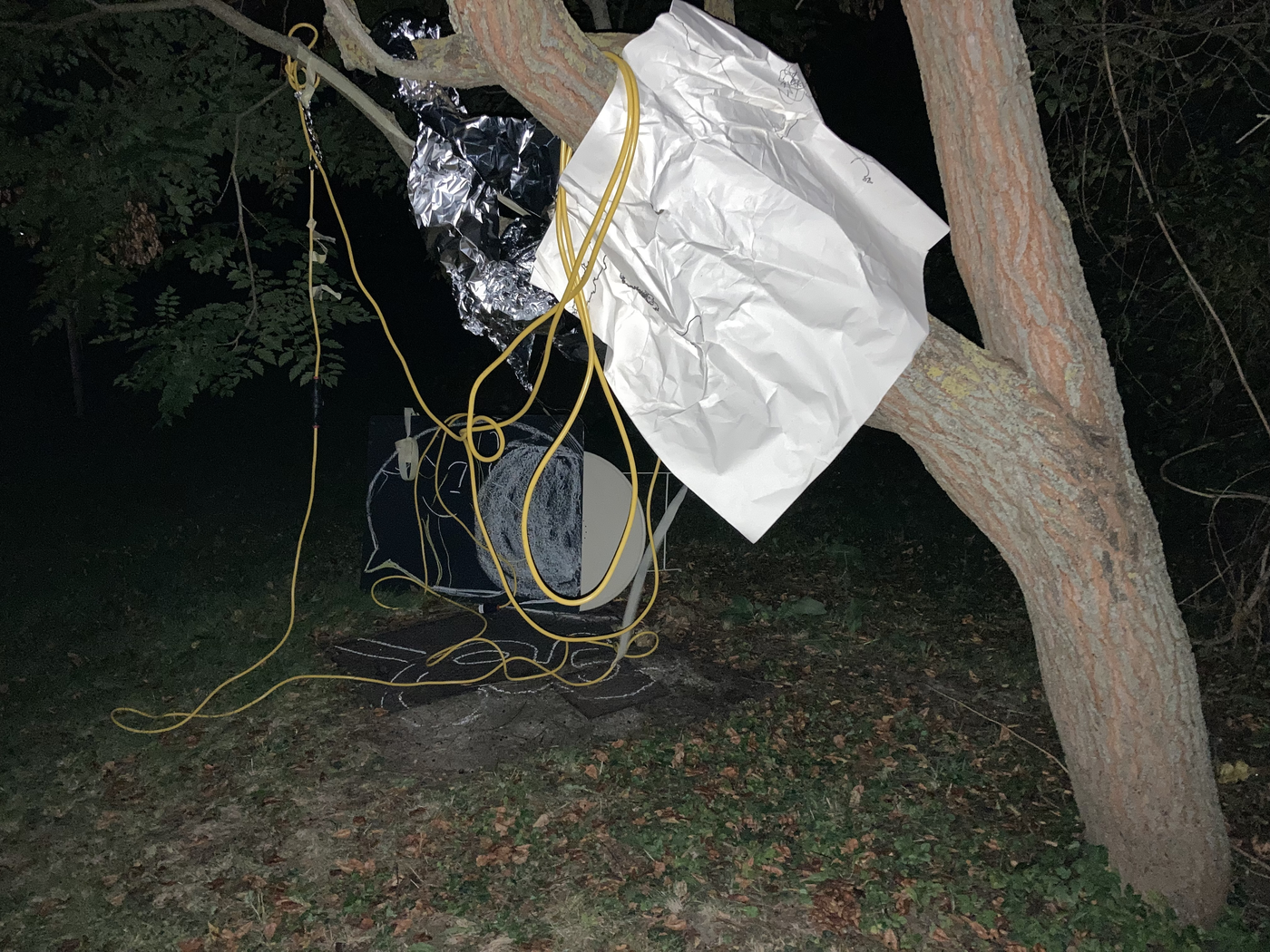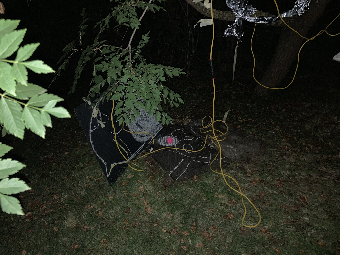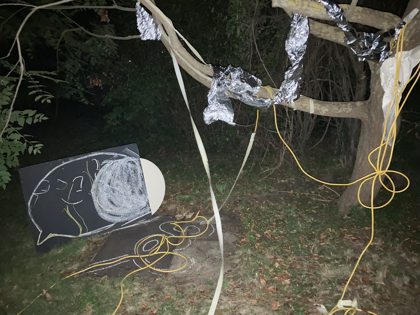 collaborative notation materials: elements of the site (tree, metallic drain well cover, grass, soil, etc.), electric cables, chalk, blackboard, garden table, tinfoil, marker pen, tape, mobile phone camer with and without flash, and video