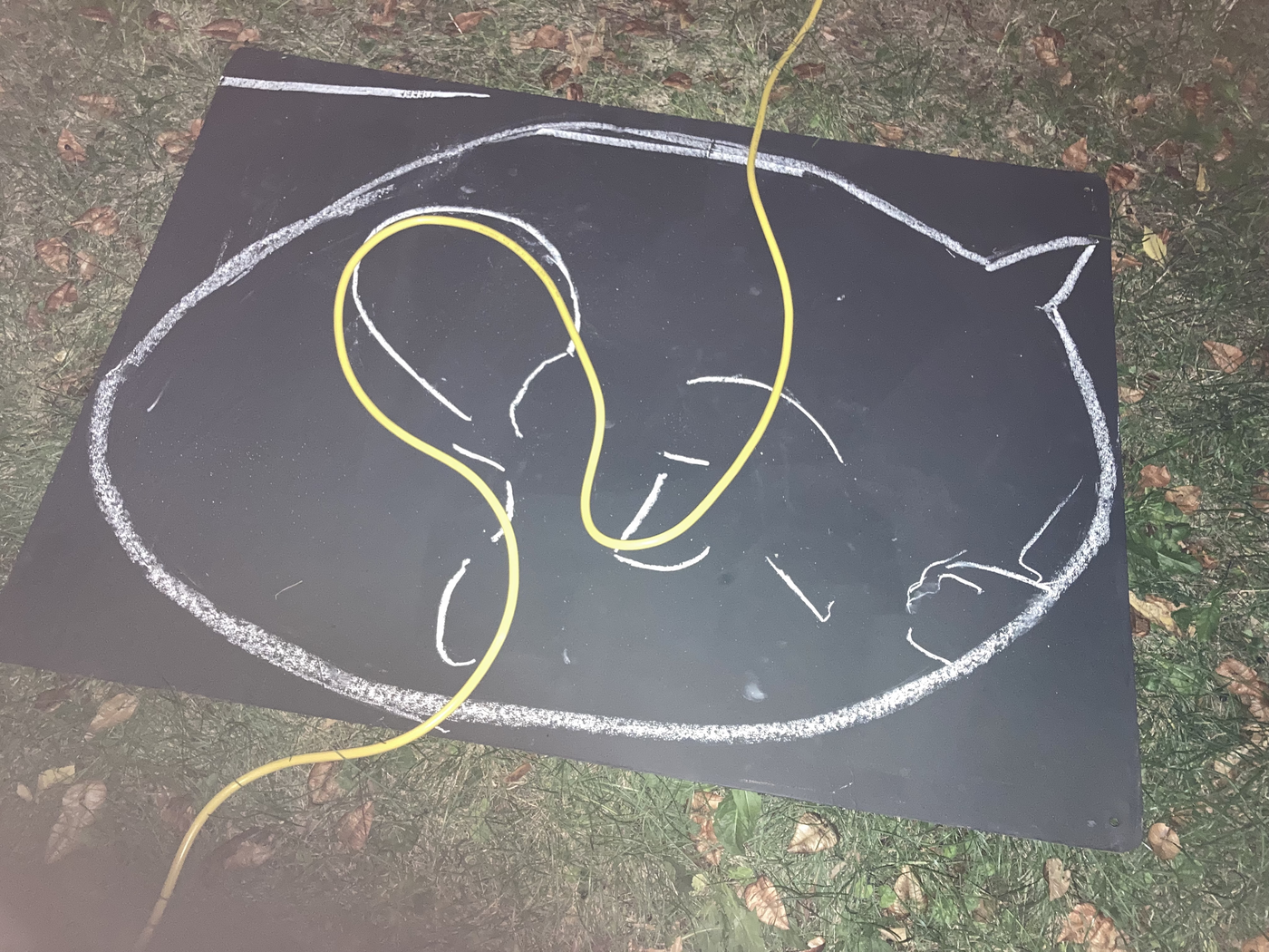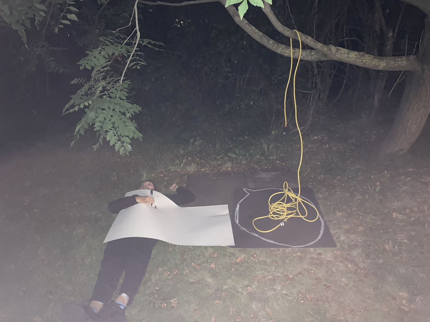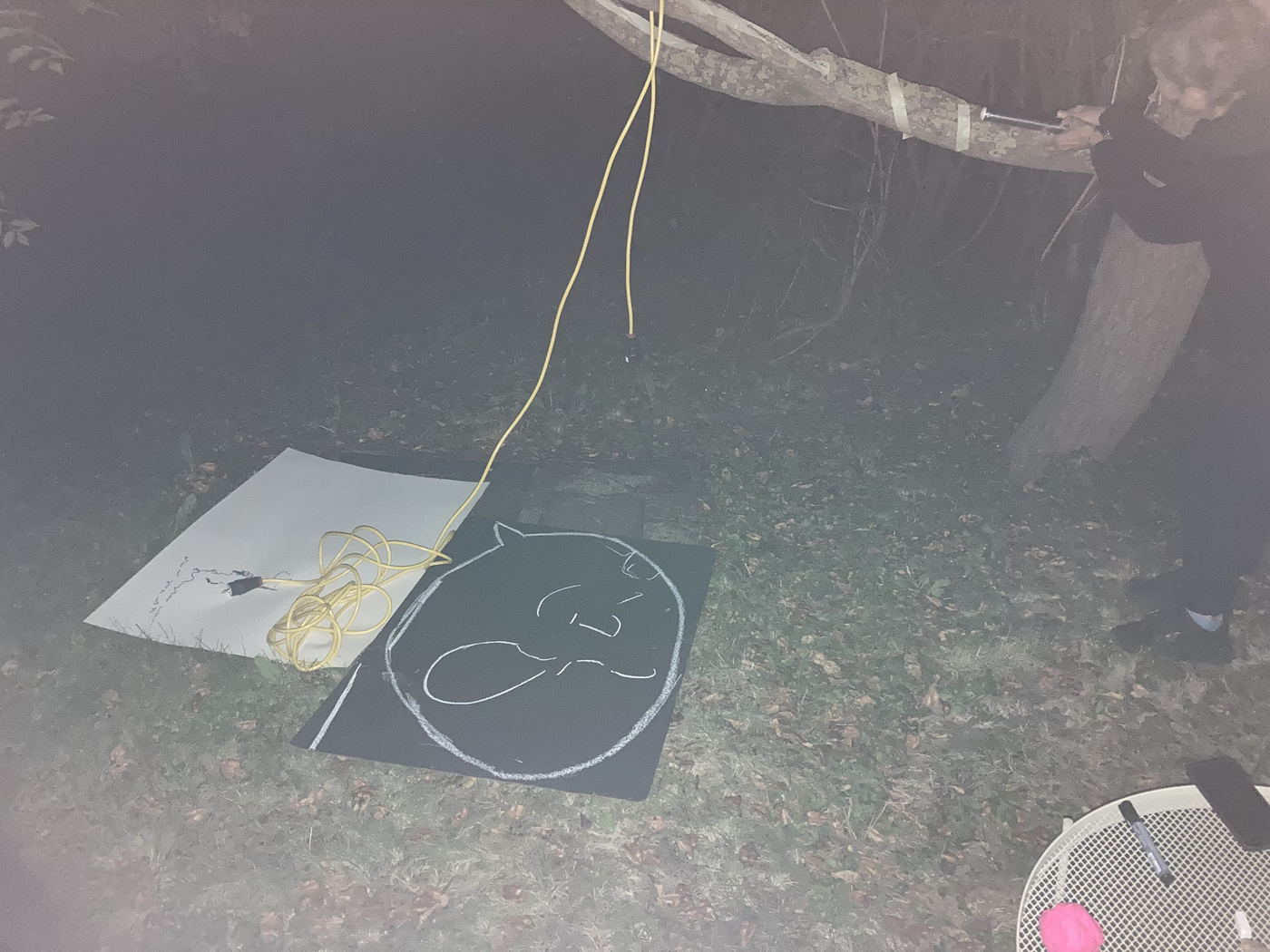 collaborative notation materials: elements of the site (tree, metallic drain well cover, grass, soil, etc.), electric cables, chalk, blackboard, garden table, tinfoil, marker pen, tape, mobile phone camer with and without flash, and video
