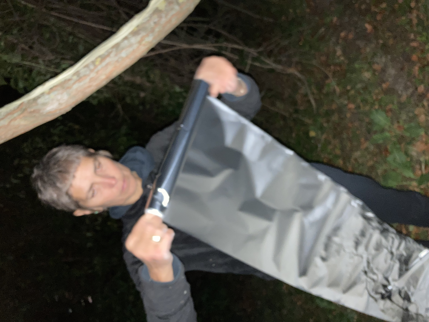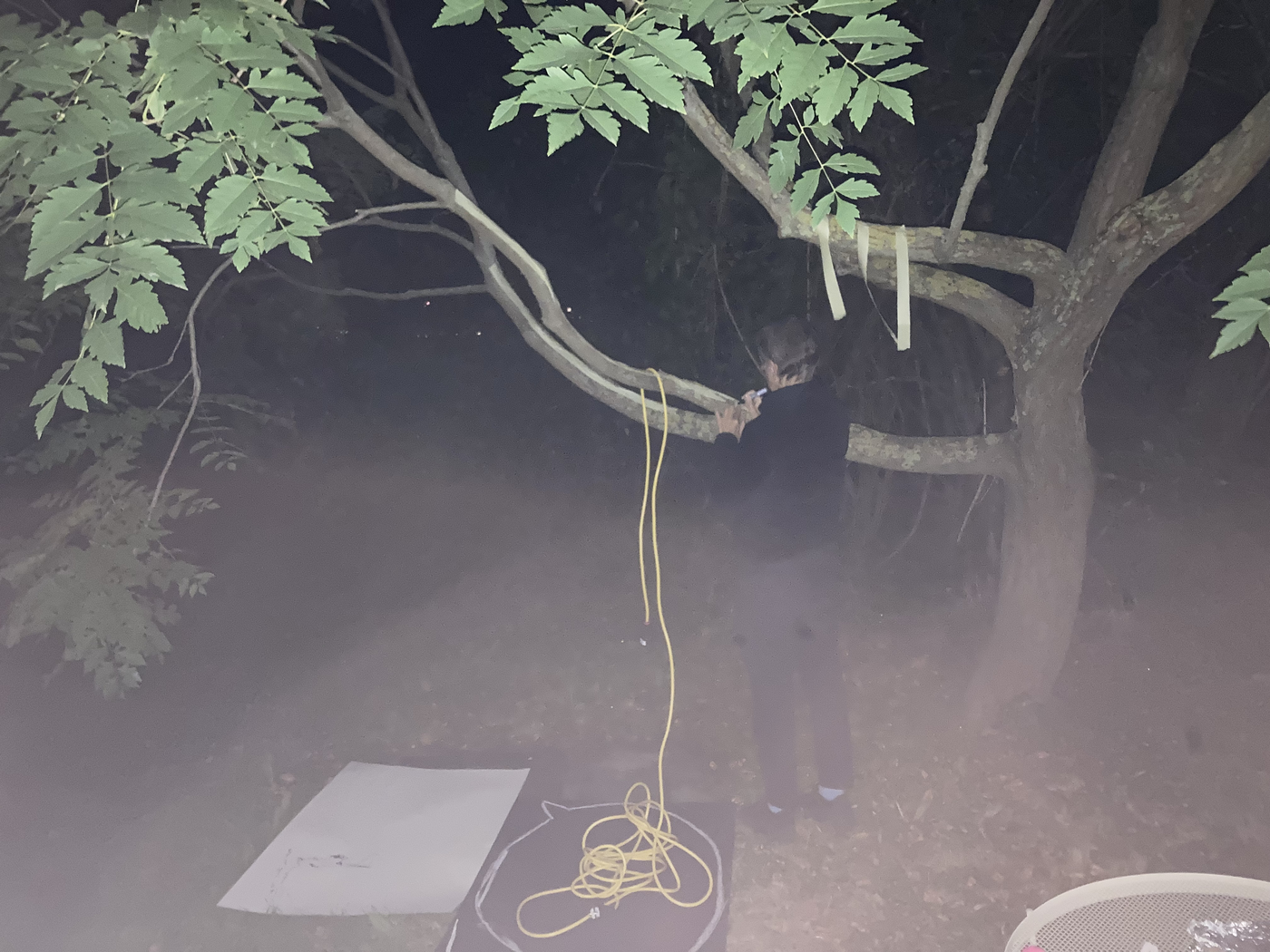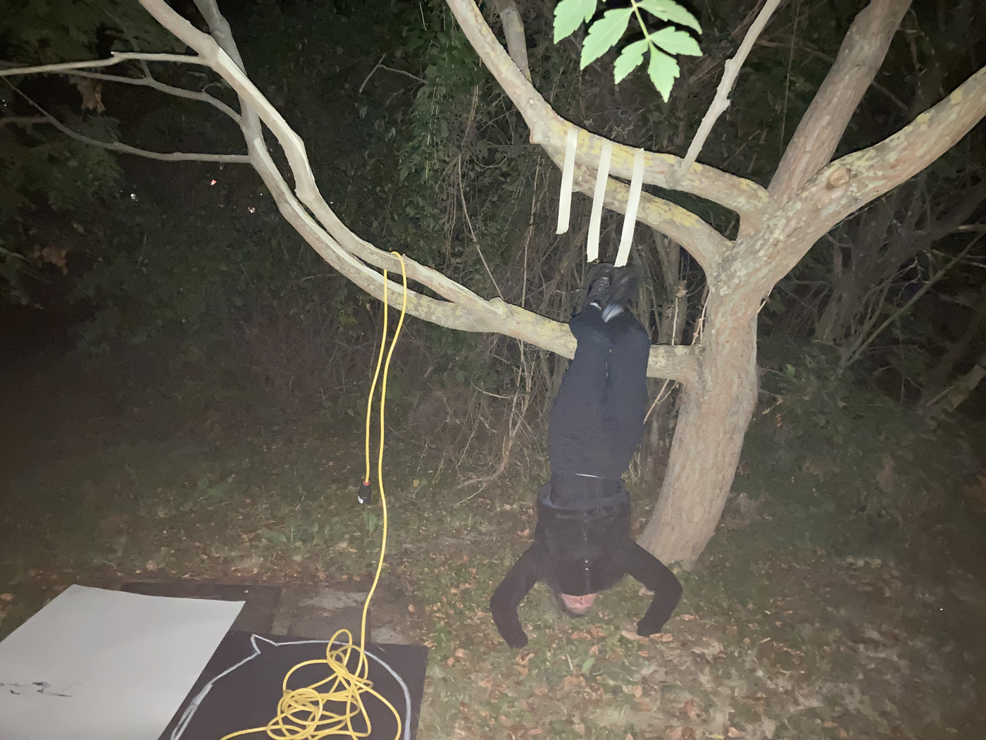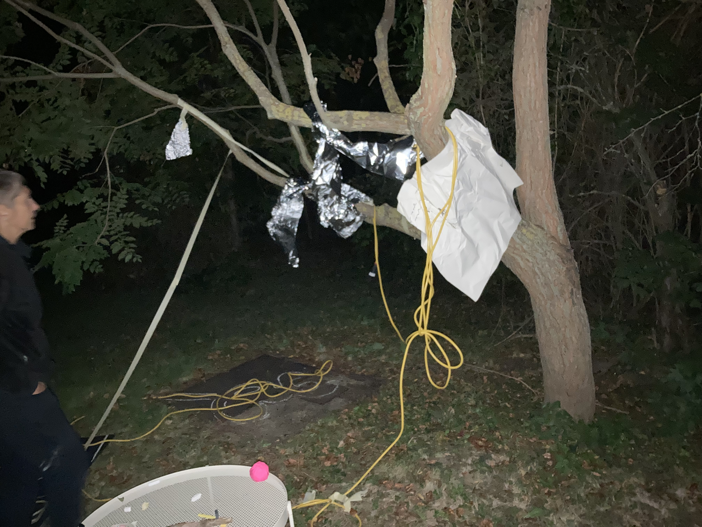 collaborative notation materials: elements of the site (tree, metallic drain well cover, grass, soil, etc.), electric cables, chalk, blackboard, garden table, tinfoil, marker pen, tape, mobile phone camer with and without flash, and video