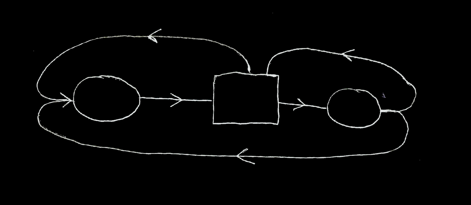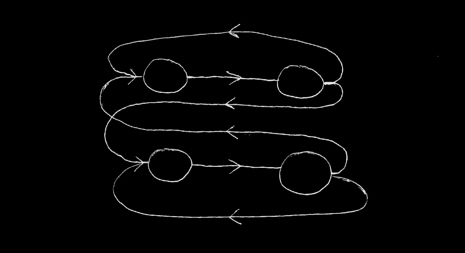 In this next drawing, two of these recursive processes are connected and affect one another. Due to these connections, the possible outcomes of the system become significantly more complex. One of the strategies often used in my practice links up two or more feedback processes with contrasting tendencies. One process might attempt to increase a voltage while the other attempts to decrease it. When these two processes feed into each other, it becomes difficult to tell which process will make the most significant impact. The resulting system becomes sensitively dependent on the balance between these processes as a procedural friction is introduced. Only a few of these kinds of interconnected feedback loops need to be in place to establish a chaotic system. In a way, the system could be considered to turn chaotic when predicting outcomes is no longer merely difficult but unforeseeable, due to the sensitivity of the complex codependencies. A chaotic system like this will continually try to self-balance, swinging back and forth between an uncountable amount of non-equilibrium states. These states can be described as constellations of strange attractors within the phase space of the system. The actual behavior of the system becomes the particular orbit that the process revolves around, as it is pulled into different directions by these strange attractors.